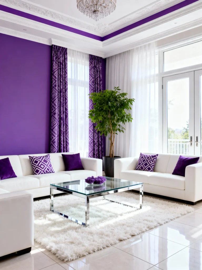This room uses a deep violet on the walls to create a truly luxurious, saturated space. It’s a bold color choice that feels grand and stylish. The white sofa and rug are essential to balance the intense wall color and the geometric patterned purple curtains. The glass coffee table and simple white tile keep the focus on the regal color palette.