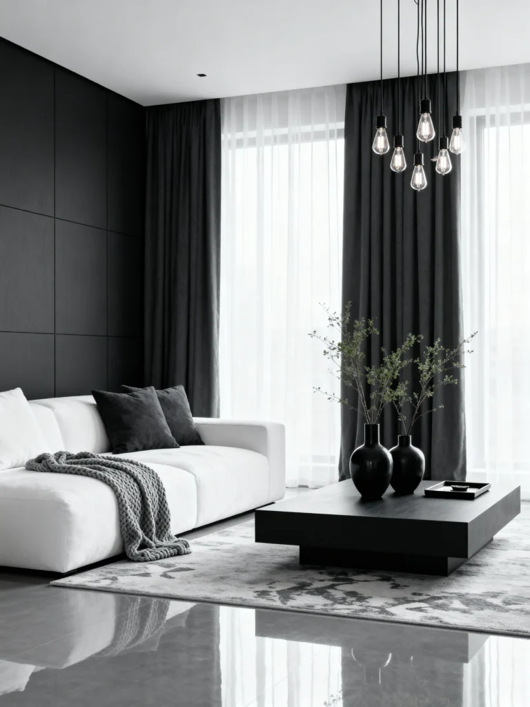 This look is all about sophisticated drama. The deep charcoal accent wall is a perfect, moody backdrop for the crisp, bright white sofa. Paired with sheer and heavy grey curtains, it creates a cozy, high-contrast space that feels incredibly modern and chic. The simple gold-stemmed chandelier adds a nice, subtle touch of warmth.
