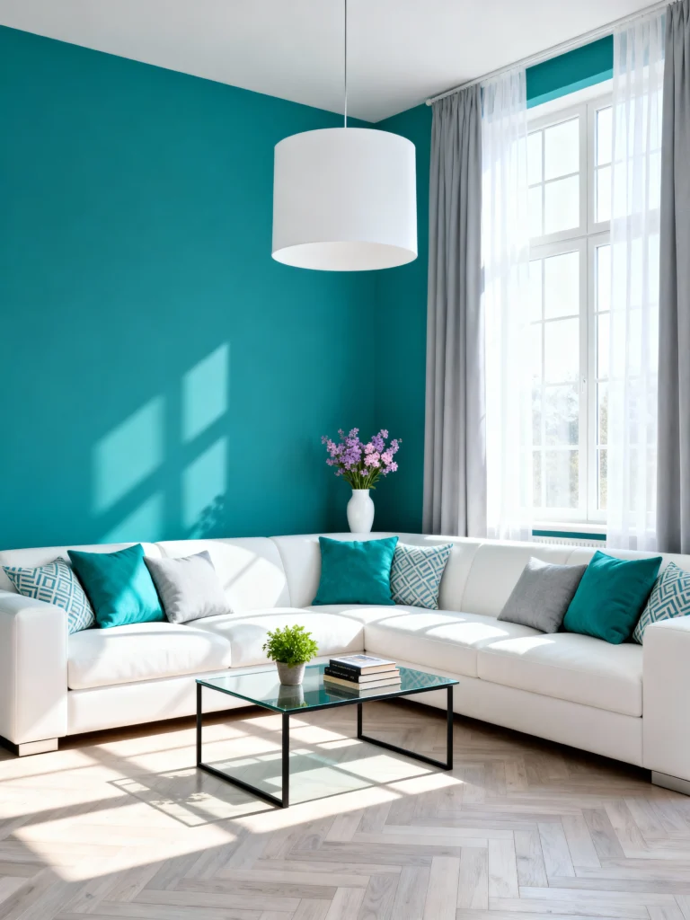 Wow, that rich teal is a showstopper! It’s an elegant jewel tone that instantly makes the room feel luxurious. The light grey sectional sofa and pillows provide a sophisticated counterbalance to the vibrant wall. The clear glass and black metal coffee table is sleek and modern, perfectly complementing the contemporary feel.