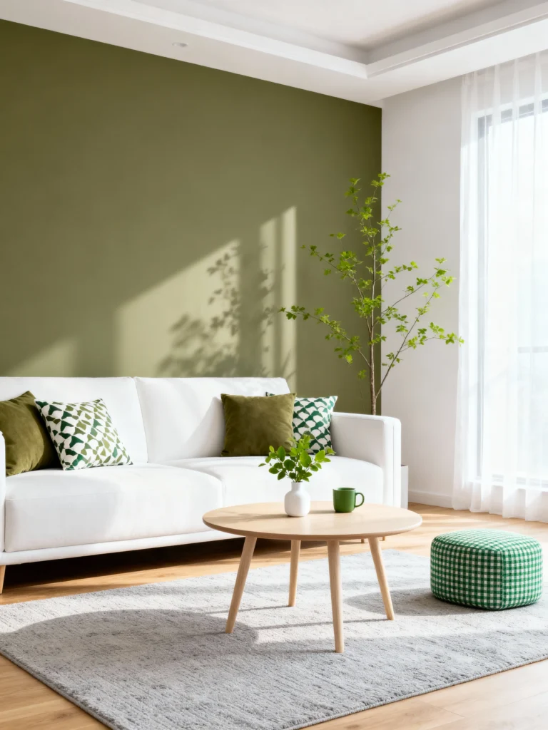 This lovely shade of olive green is a fantastic bridge between nature and modern style. It’s a grounded and calming color that pairs beautifully with the natural wood coffee table and woven pouf. The white sofa and bright windows ensure the room stays light and airy, avoiding a dark or dull look.