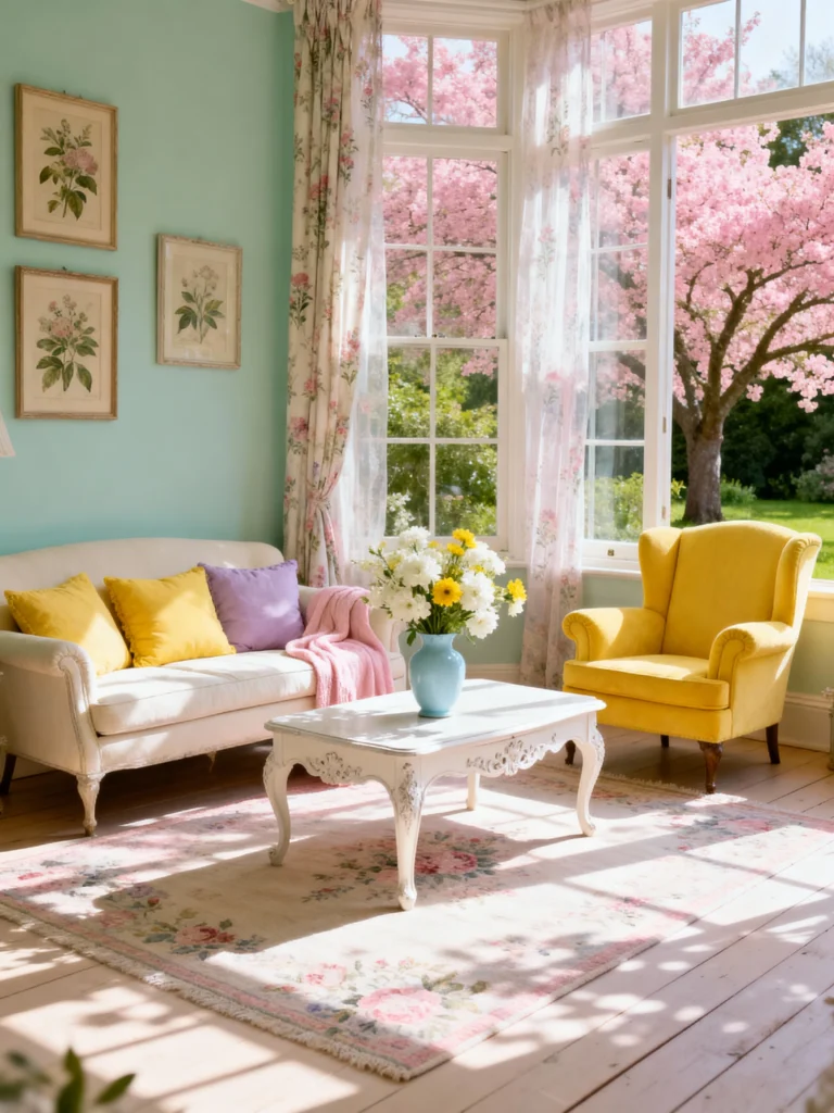 This light, gentle mint green wall is straight out of a beautiful English cottage! Paired with the floral rug and curtains, it creates a wonderfully feminine and cheerful atmosphere. The classic white sofa and yellow accent chairs add a lovely burst of sun, making the whole room feel happy and romantic—especially with the view of blooming trees outside!