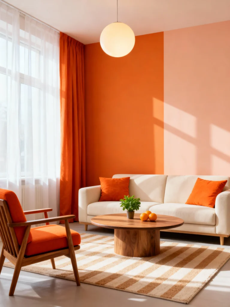 Talk about energizing! The bold split wall—half vibrant orange and half soft apricot—is an instant mood-booster. This playful use of color makes the room feel fun, energetic, and modern. Simple, light-colored furniture lets the walls and matching orange cushions do all the talking. This is happiness on a wall!