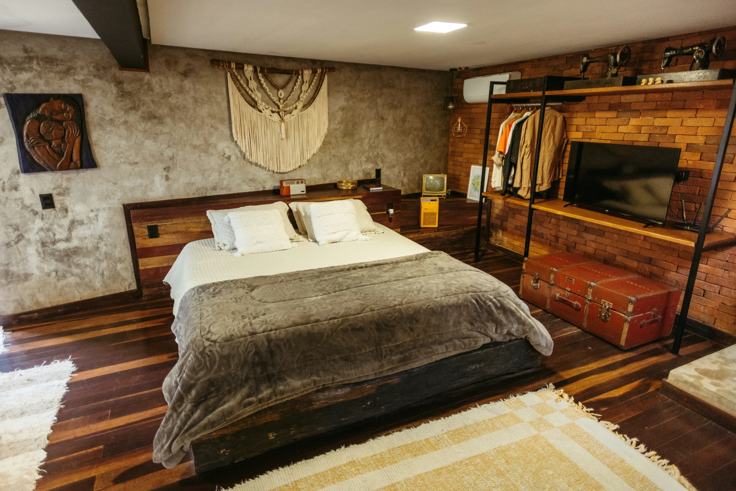 Talk about cozy drama! This room feels like a luxurious, hidden treehouse or safari tent. The dramatic vaulted ceiling and deep wood tones create a cocoon of comfort. The warm, ambient lighting tucked into the shelving behind the bed is the real star, highlighting the natural materials and creating an incredibly intimate, golden glow. This is the definition of a moody, romantic retreat.