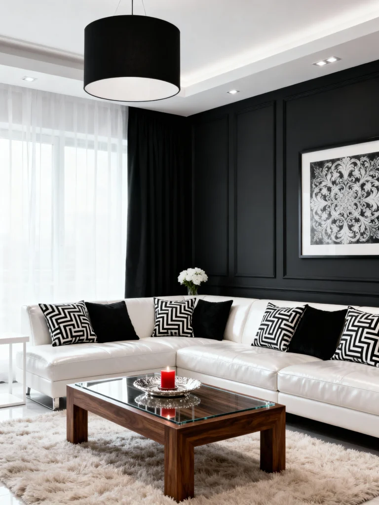 - High Contrast: Use bright white for the rest of the walls and the main furniture pieces to make the black stand out.