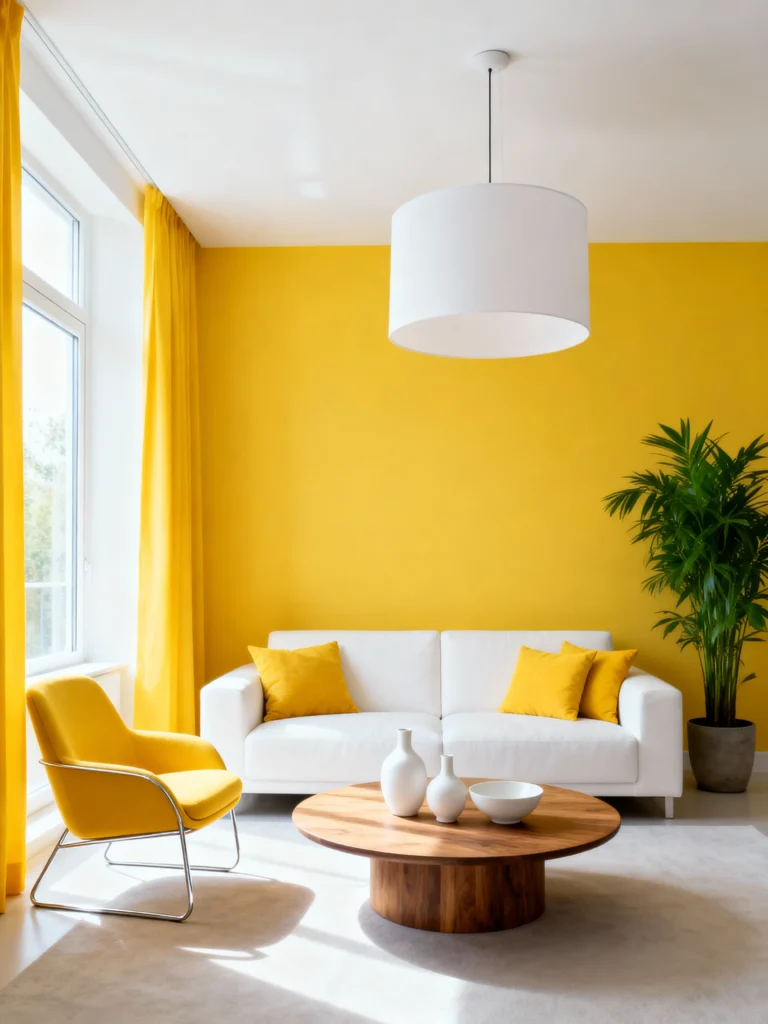 - Crisp White: Use a bright white sofa, chairs, and ceiling trim to make the yellow feel even more luminous.