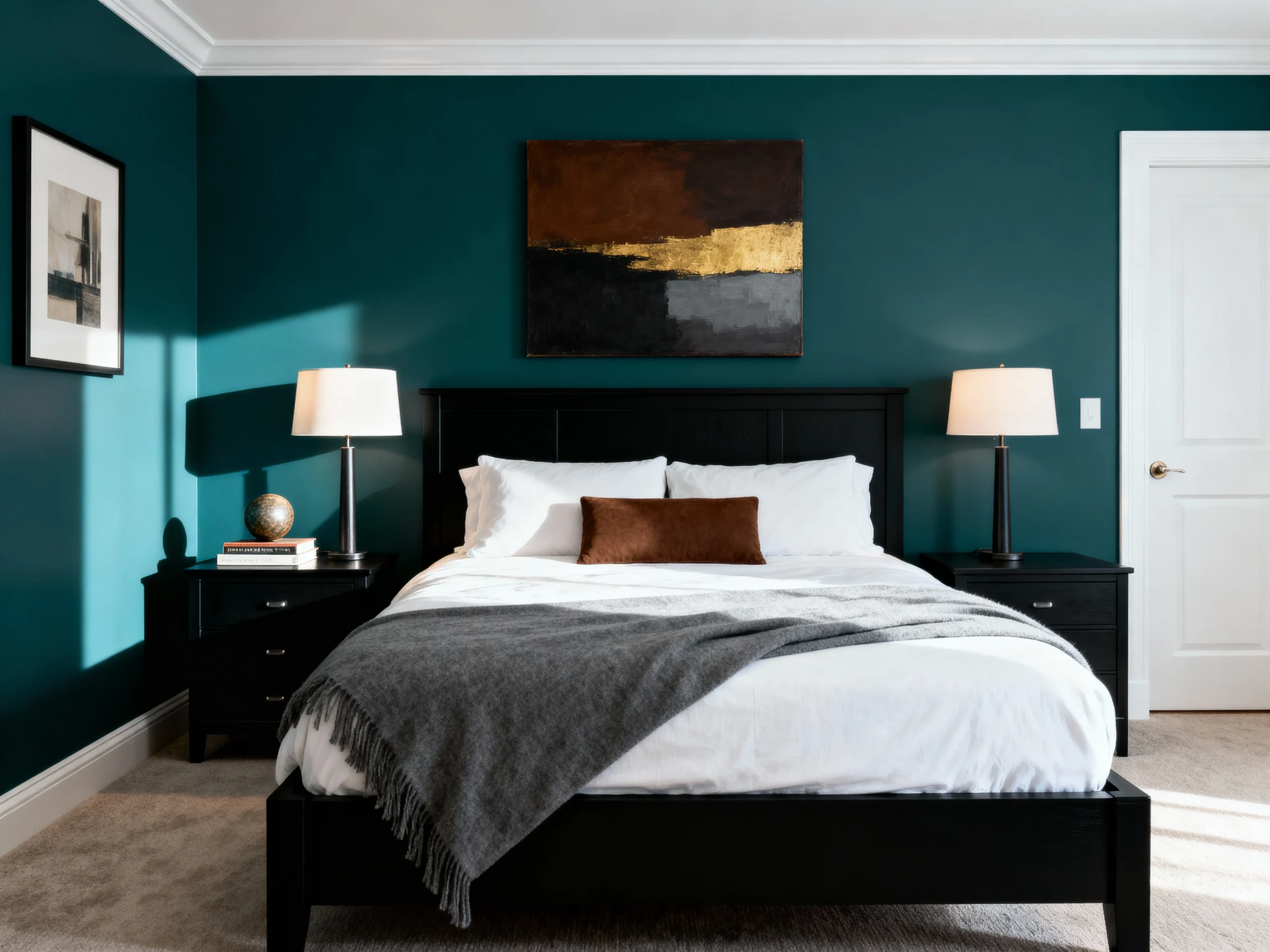 Create a cozy, cocooning feel with deep forest green walls. Keep the bedding simple with white sheets and a chunky cream knit throw for contrast. A small, simple wooden side table and a modern, adjustable grey floor lamp provide function without clutter. For the ultimate warmth and texture, add a fluffy sheepskin rug over the wood floors.