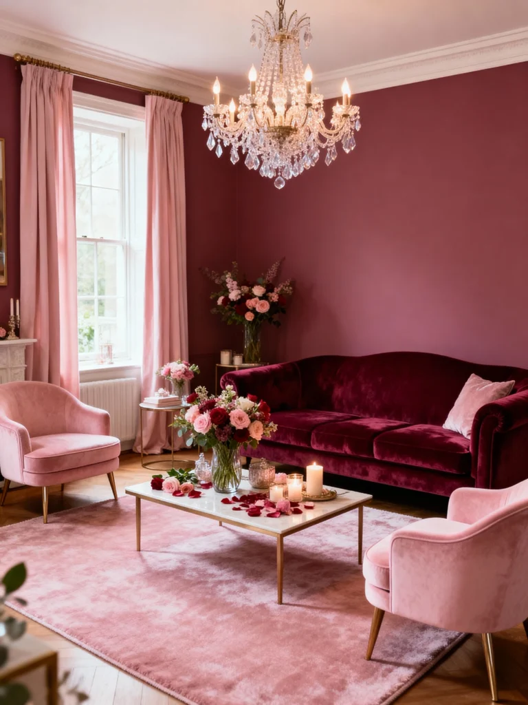 Want to feel like you’re in a Victorian novel? Burgundy walls with blush pink accents are your jam. It’s deep, it’s romantic, and it’s got that old-school charm. Think burgundy sofa, blush curtains—fancy yet cozy. Just don’t tell your buddies it’s your “love lair,” alright?