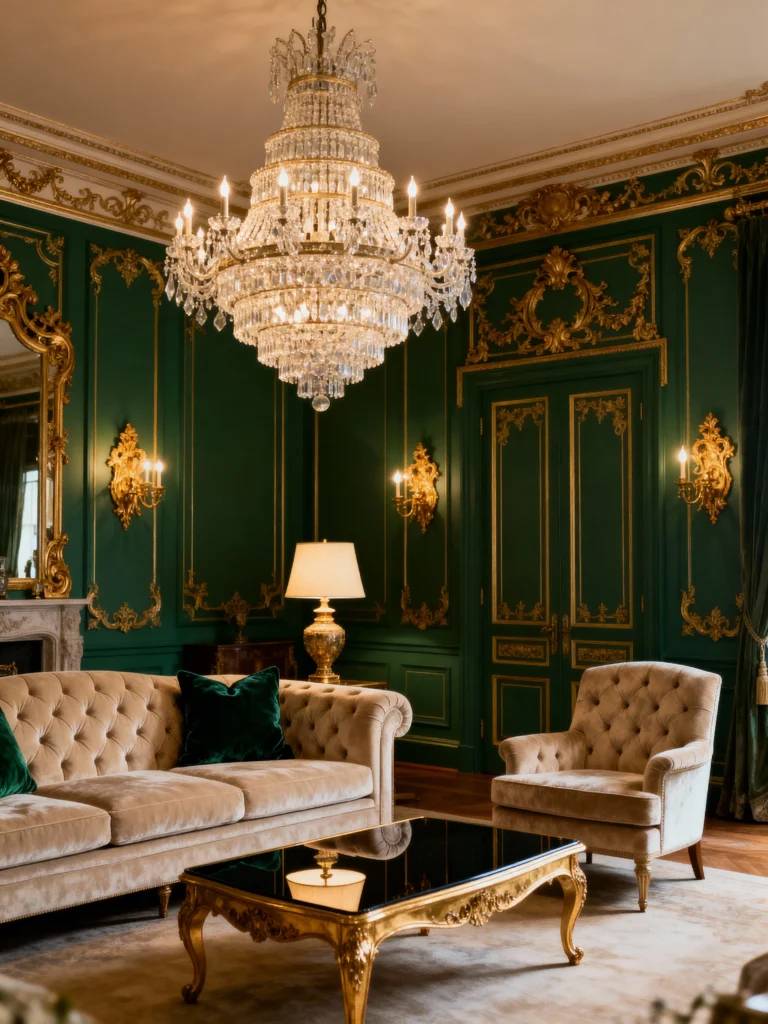 Last but not least—emerald green and gold. Think emerald walls with gold accents like a chandelier or mirror. It’s rich, it’s luxurious, and it’s basically the sitting room equivalent of a power move. FYI, this one’s a stunner.