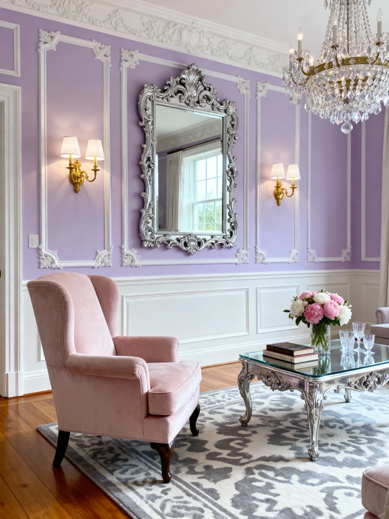Lavender walls with silver accents? Yes, please! It’s like stepping into a fairy tale—soft, elegant, and a little magical. A silver coffee table or lamp pairs perfectly with that pastel purple. This combo’s for anyone who wants glam without the in-your-face sparkle.