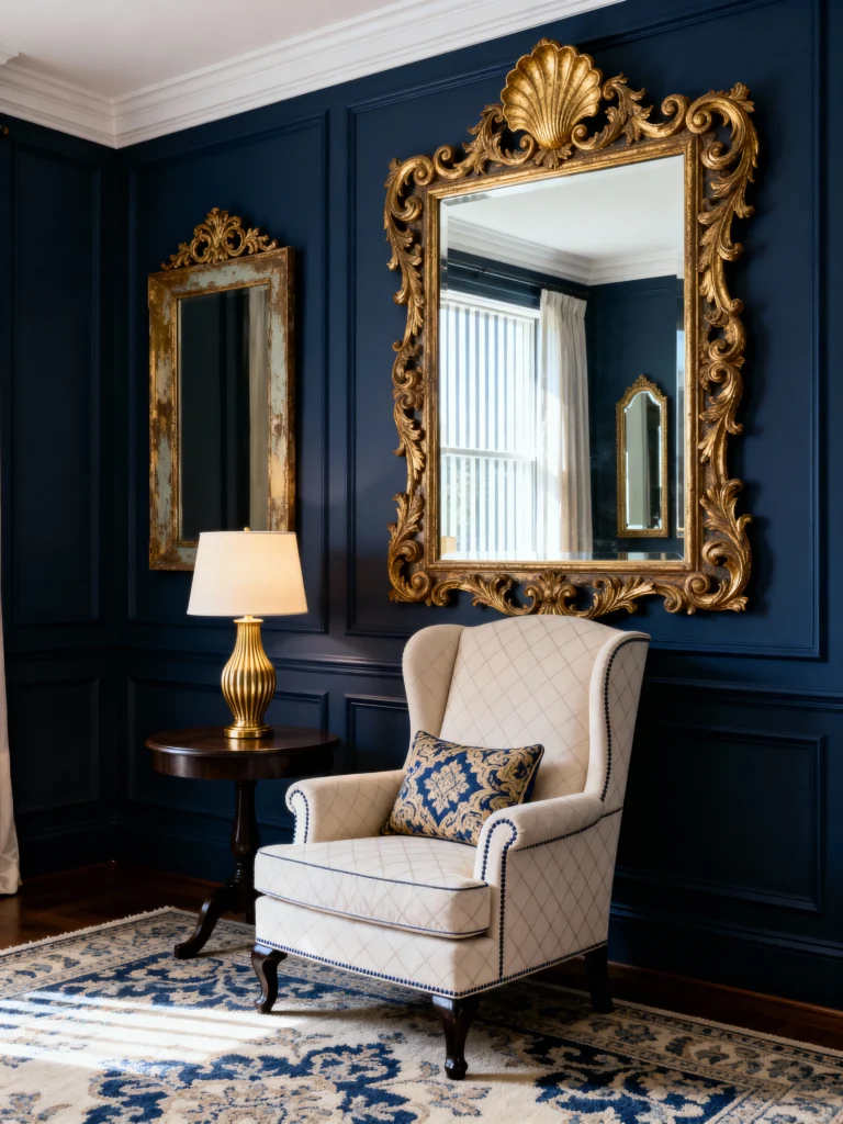 Imagine navy blue walls—like a midnight sky—paired with gold accents that scream “I’m fancy.” A gold lamp here, a gold-framed mirror there, and suddenly your sitting room looks like it belongs in a magazine. Navy keeps it grounded, while gold adds that wow factor. Just don’t go overboard with the bling, okay? Less is more.