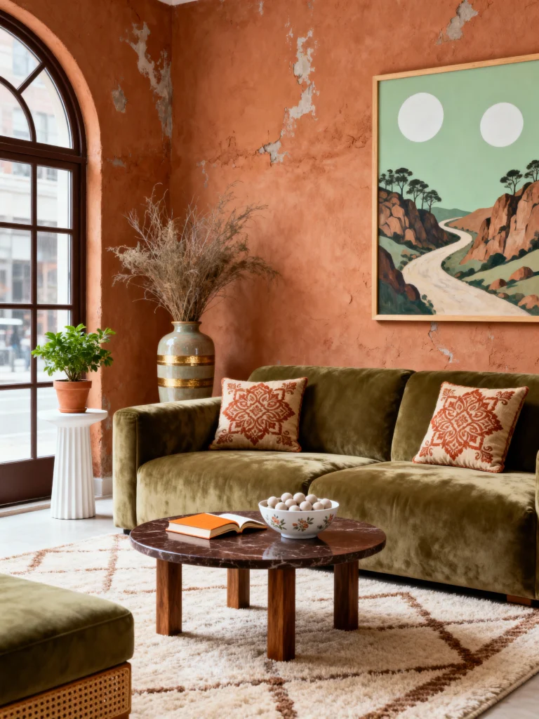 Olive green and terracotta are like that couple who’s always chill and stylish. Picture an olive green sofa against terracotta walls—warm, grounded, and oh-so-inviting. It’s earthy without feeling like you’re camping indoors. Add some pottery, and you’re golden.