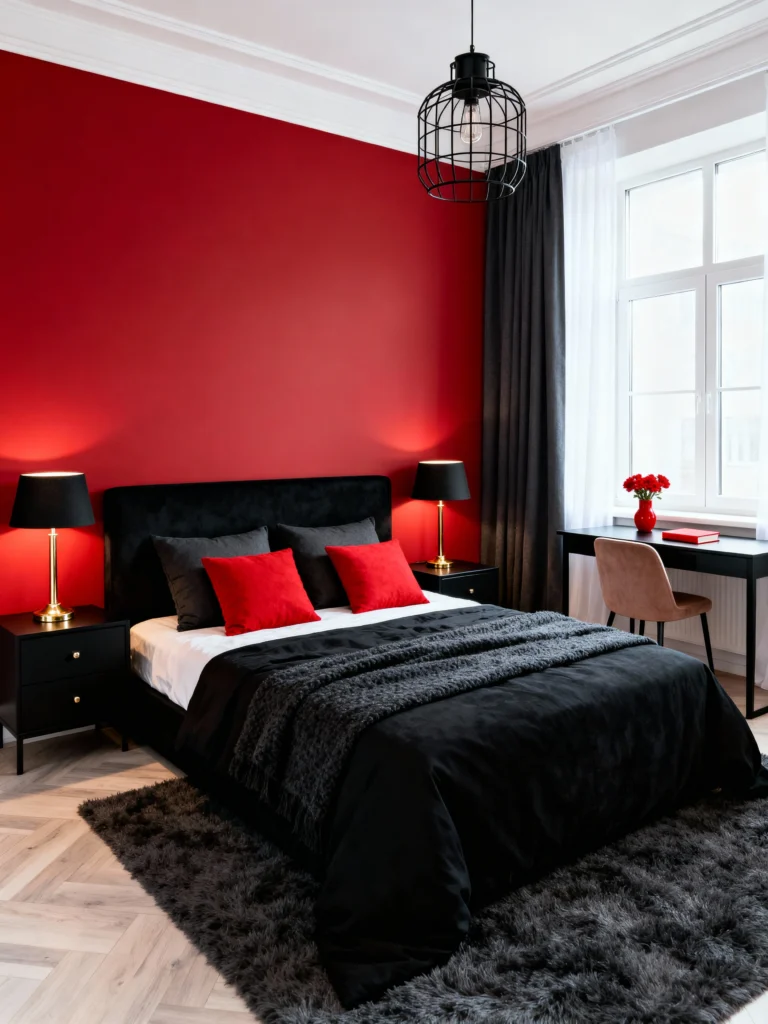 Paint the wall behind your bed a vibrant, intense red. Keep the rest of the walls crisp white to make that red truly stand out. Go for black bedding and heavy, dark grey curtains for a dramatic feel. Add a couple of bright red throw pillows and simple black lamps on black nightstands to tie the whole edgy, sophisticated look together.