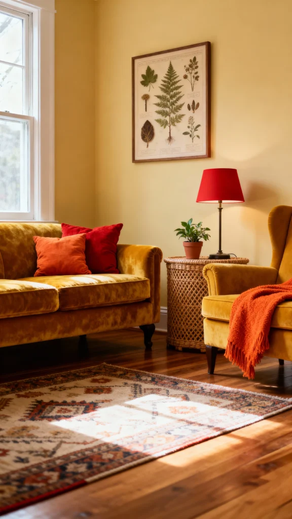 Mustard yellow, olive green, burnt orange—retro but fresh. Pair with geometric art and slim furniture. I adore this look; it’s nostalgic yet stylish. Go for bold but balanced pieces.
