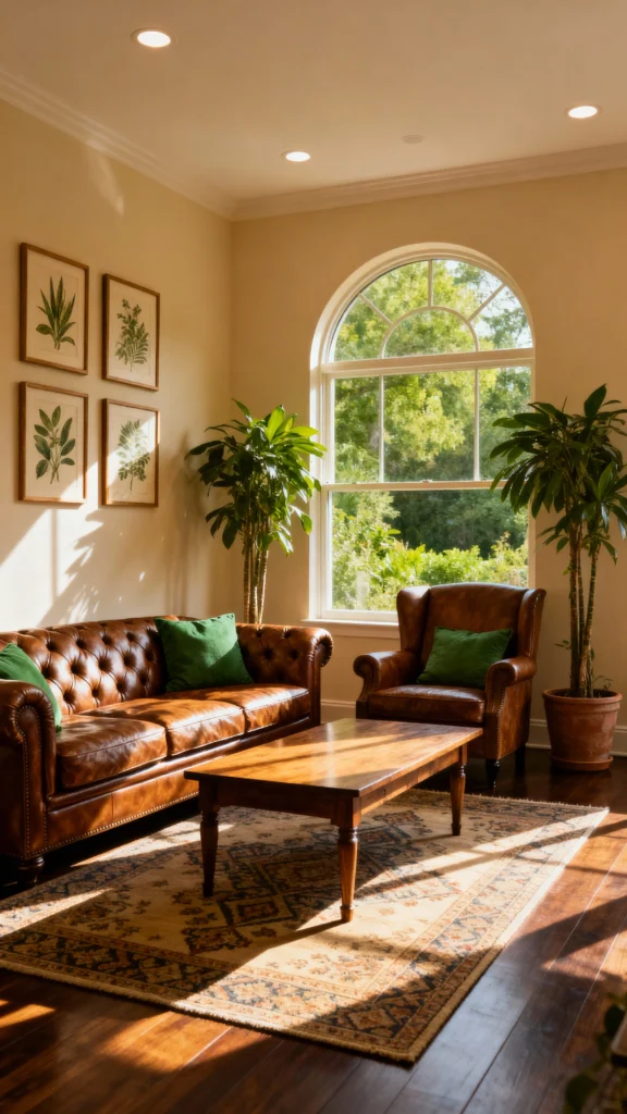 Craving a warm hug from your living room? Browns, greens, and tans—straight from nature—do the trick. Picture a sage green sofa, wooden coffee table, and terracotta rug. It’s rustic and farmhouse-y, perfect for chilling out. Add plants or stone accents to seal the deal.