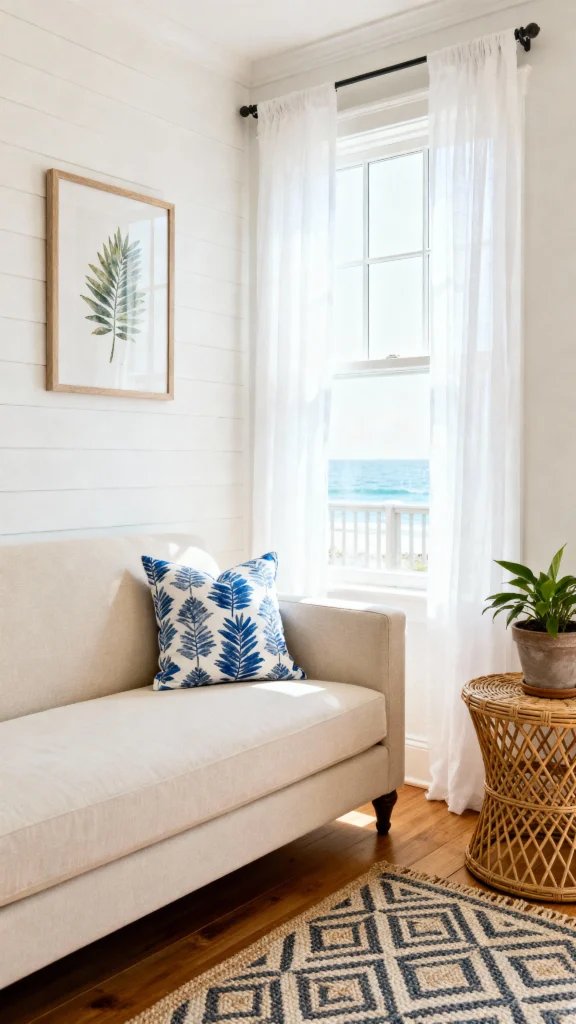 Blues, whites, and sandy beiges—beach vibes without leaving home. White walls, blue stripes, rattan furniture—it’s relaxed and breezy. Perfect for pretending you’re on vacation 24/7. Add shells or driftwood for that seaside touch.