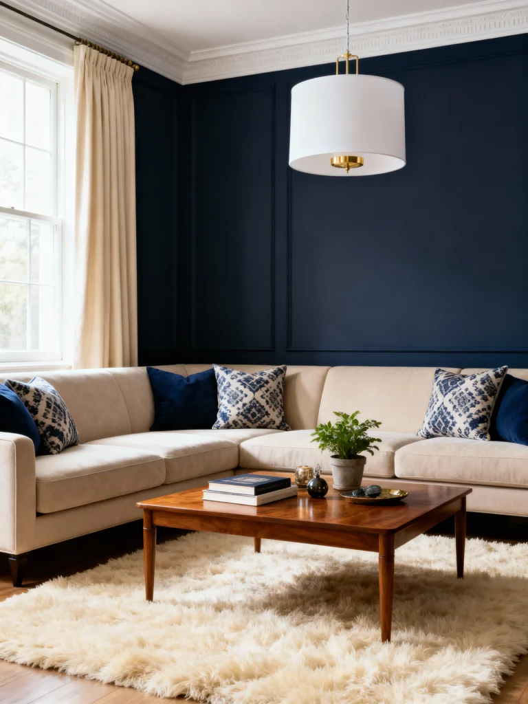 Navy is a timeless classic for a reason. It’s dramatic, grounding, and incredibly chic. This deep blue accent wall provides a perfect, crisp contrast to the light beige sofa and rug, making both the furniture and the dark wall pop. The warm wood coffee table and gold accents keep the deep color feeling inviting rather than stark.