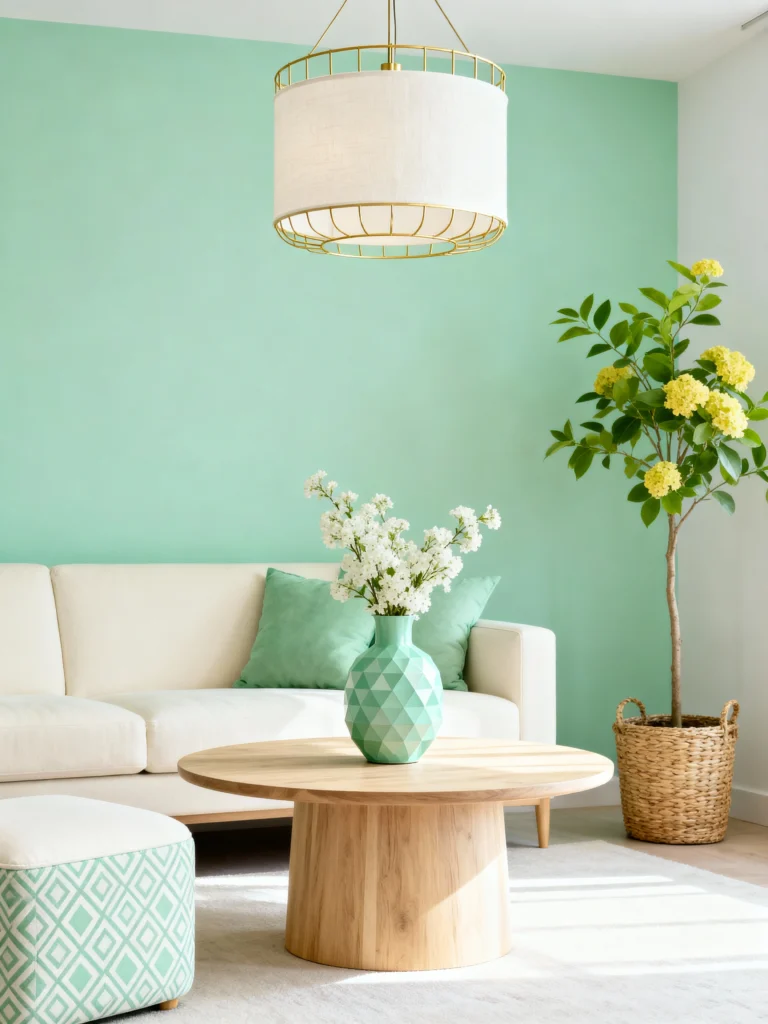 If you’re looking for something bright and refreshing, this minty green is a winner! It has a very cheerful, almost retro-meets-modern feel. The color works beautifully with the white couch and the natural wood of the coffee table, creating a light, airy, and slightly playful space. It’s like a breath of fresh air indoors!