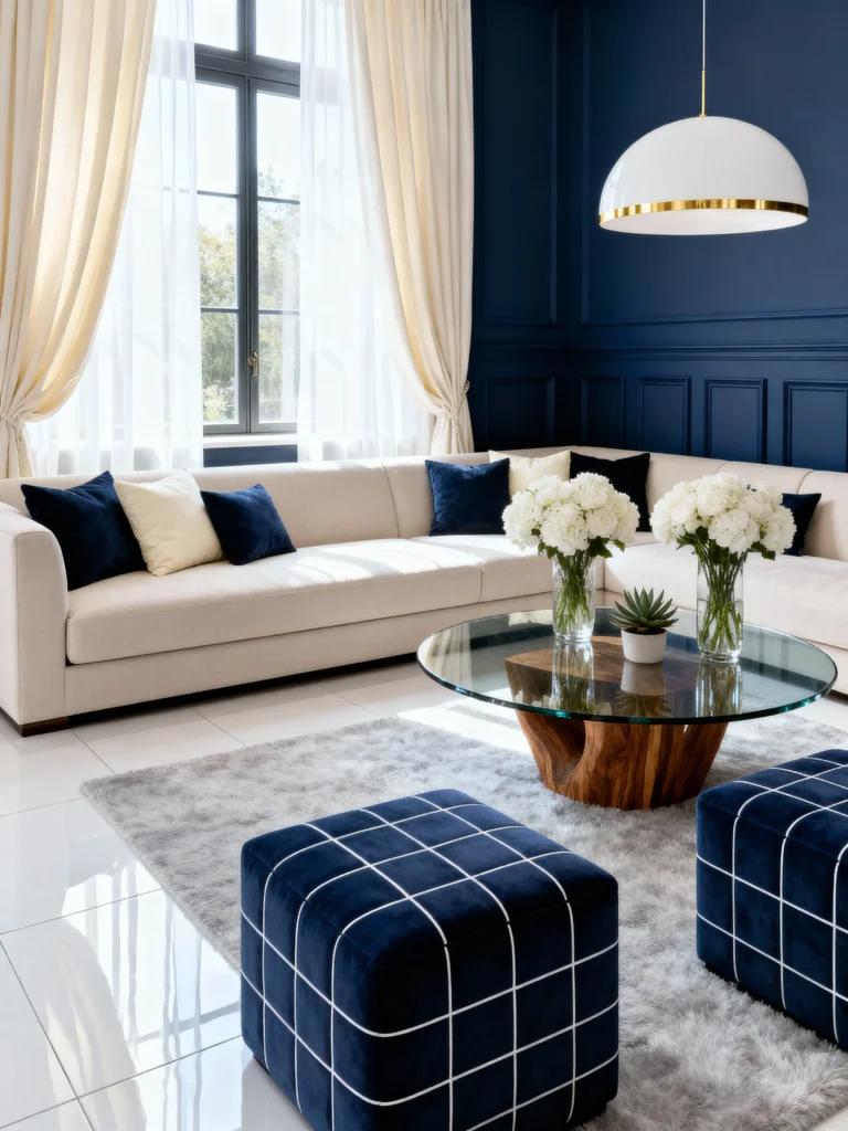 - Mix patterns: Use a subtle geometric pattern, like on the blue poufs, to add interest without competing with the wall color.