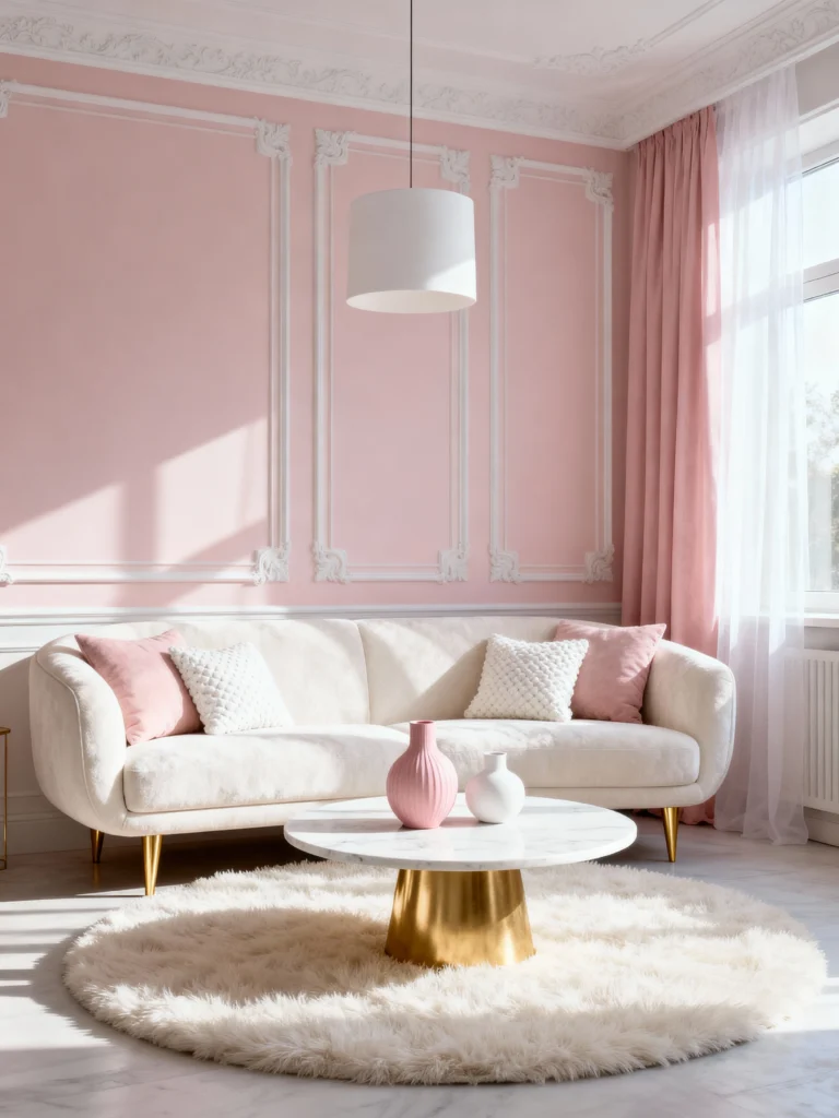 Talk about sophisticated softness! This beautiful blush pink is airy and elegant, creating a dreamy, soothing atmosphere. The all-white furniture and plush rug enhance that luxurious, cloud-like feeling, while the architectural wall molding (called picture frame molding) adds a classic, high-end touch. It’s soft and romantic without being overly sweet.