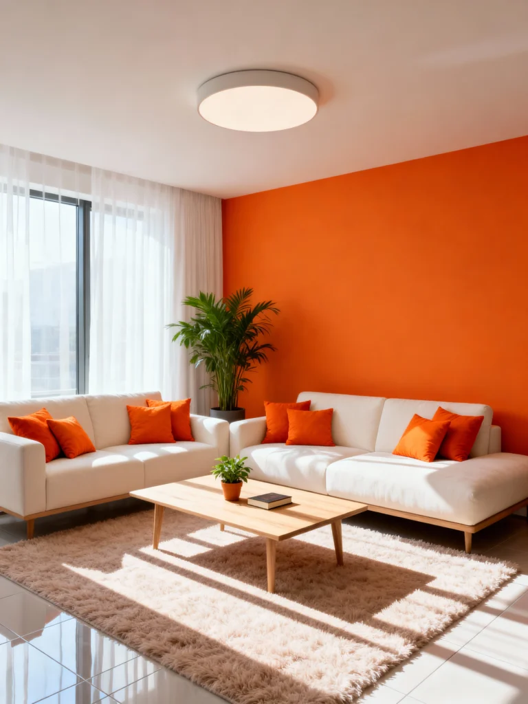 This vibrant orange is pure energy! It’s such a bold, happy color that immediately makes the space feel sunny and inviting, even on a cloudy day. Notice how the light-colored sofa and rug keep the room from feeling overwhelming, and the natural wood coffee table adds a lovely, grounding touch.