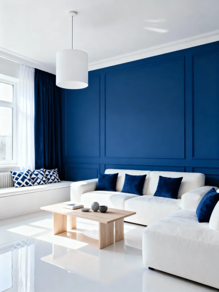 You can’t go wrong with a classic, calming Deep Blue. This look is effortlessly elegant, using the stunning blue wall paneling to frame the room. The clean white sofa and bright white floor tiles prevent the deep color from feeling heavy, giving it a fresh, coastal vibe. The natural wood coffee table adds a necessary touch of warmth.