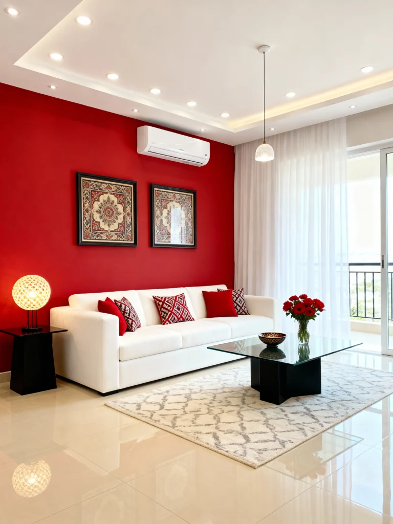 - White Balance: Use a lot of white or cream in the main pieces (sofa, rug, floor) to let the red breathe and provide visual relief.