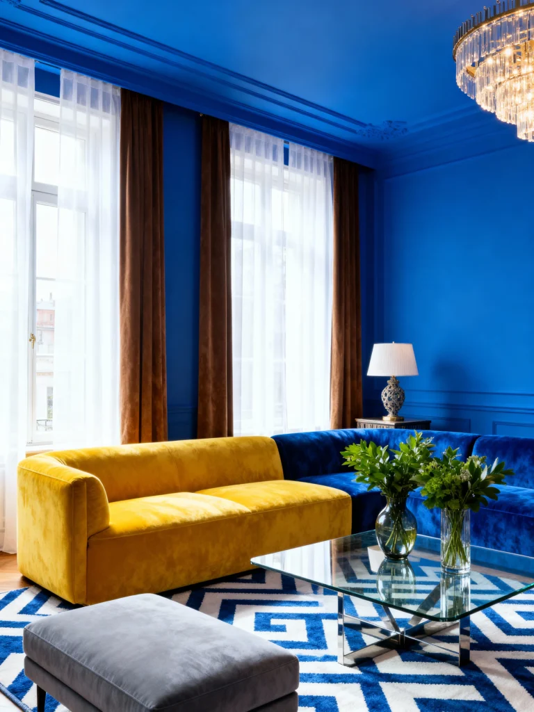 Wow, talk about a high-voltage room! This space embraces a dynamic complementary color scheme: intense Cobalt Blue on the walls and ceiling, clashing brilliantly with a bold Canary Yellow sofa. The rich brown curtains and cool gray ottoman and rug temper the high energy, proving that you can use primary colors without feeling childish—it just looks incredibly chic and confident!