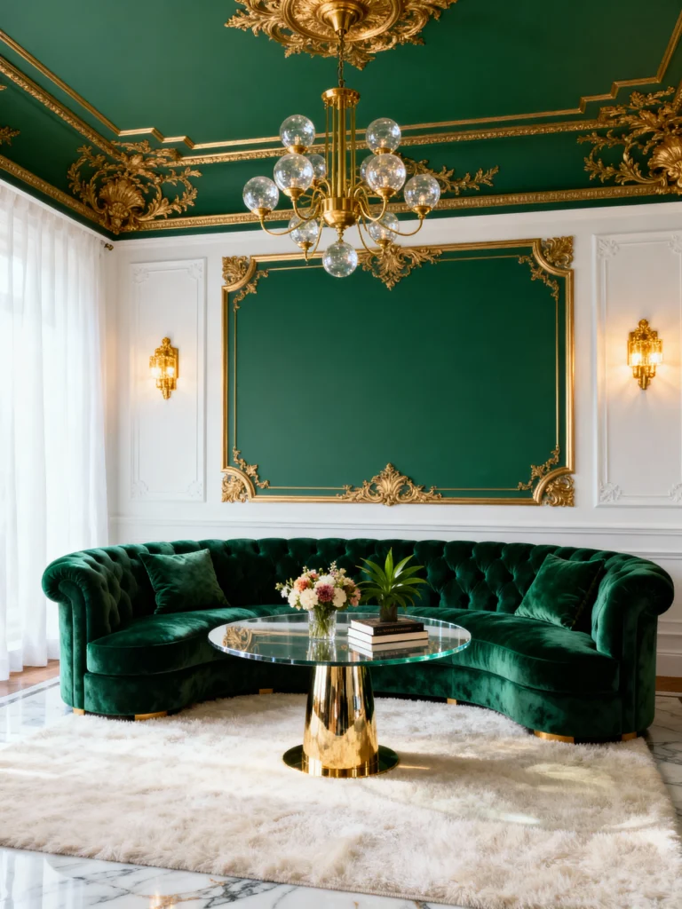 This room screams luxury! The deep Emerald Green walls and the matching velvet tufted sofa are a stunning, classic pairing. The secret ingredient? Gold. The ceiling trim, the chandelier, and the coffee table base all add opulent warmth, making the jewel tone truly sparkle. This feels like a modern-day palace!