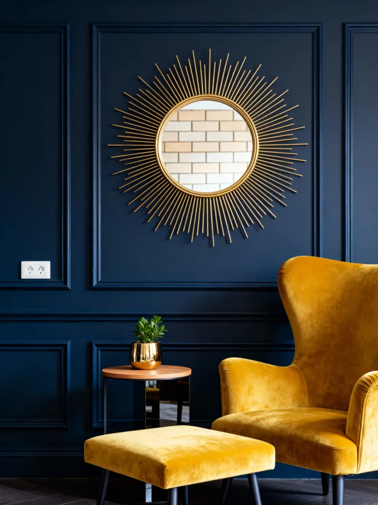 This look is pure drama! The deep, moody Navy Blue wall acts as a sophisticated backdrop for that brilliant, sunny Mustard Yellow velvet armchair. It’s a gorgeous, daring contrast that feels chic and modern. Notice how the golden sunburst mirror adds a touch of glamour, perfectly complementing the yellow chair.