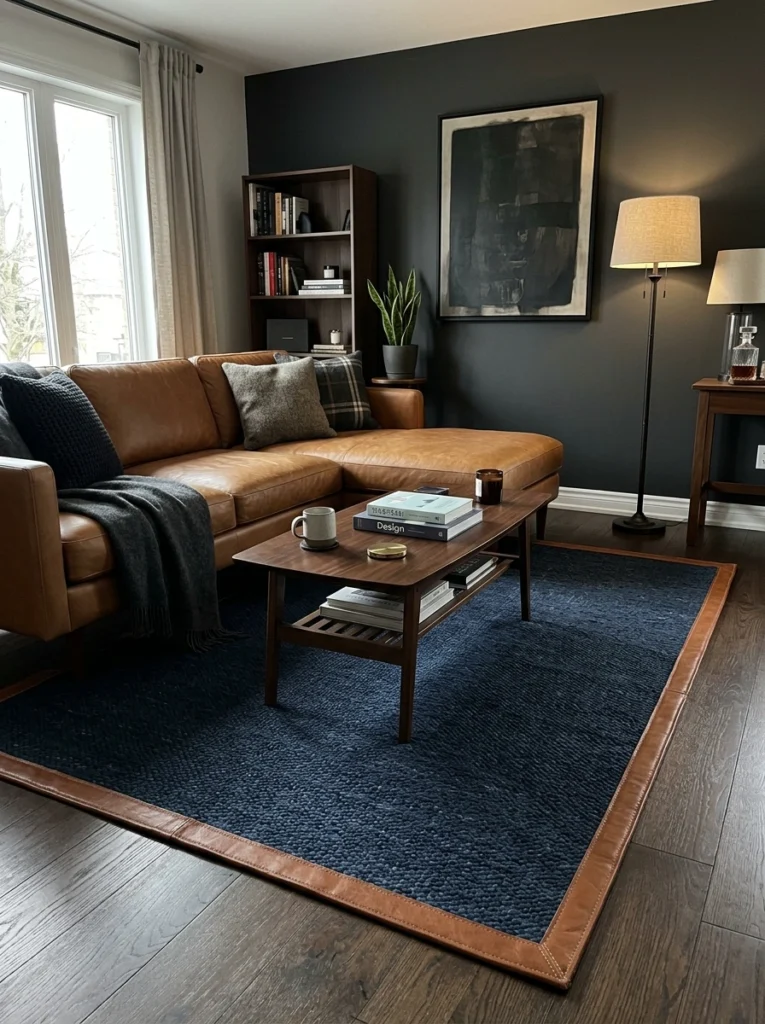 Navy is basically the tailored blue blazer of interior design. It’s a modern luxe staple that never goes out of style. Look for a navy rug that incorporates subtle leather accents or binding around the edges. Its a perfect choice for spaces featuring tan or cognac leather sectionals. The cool, deep blue tones balance out the warm orange-browns of the leather perfectly, creating a sleek interior styling vibe that feels rich and deliberate.