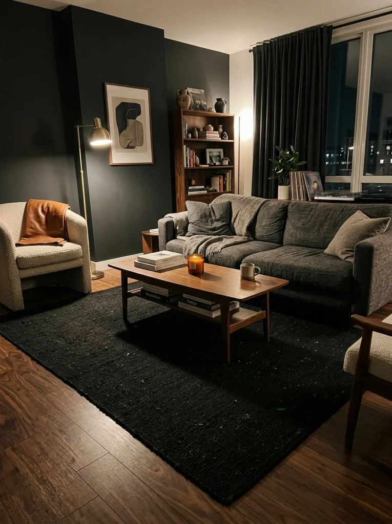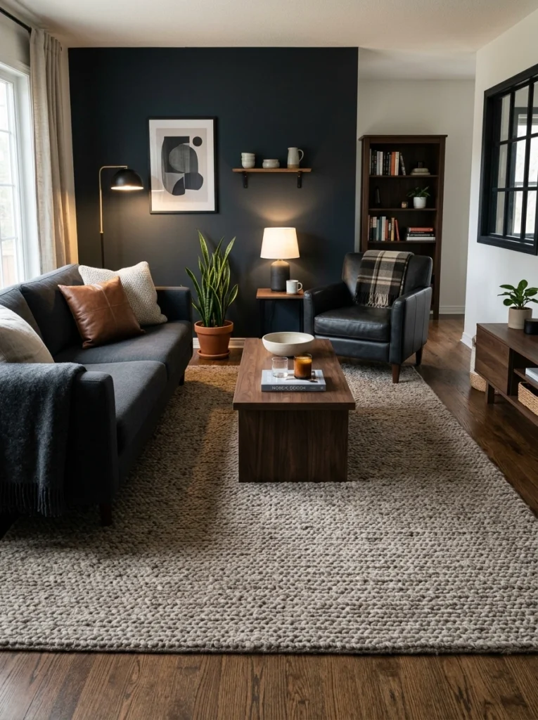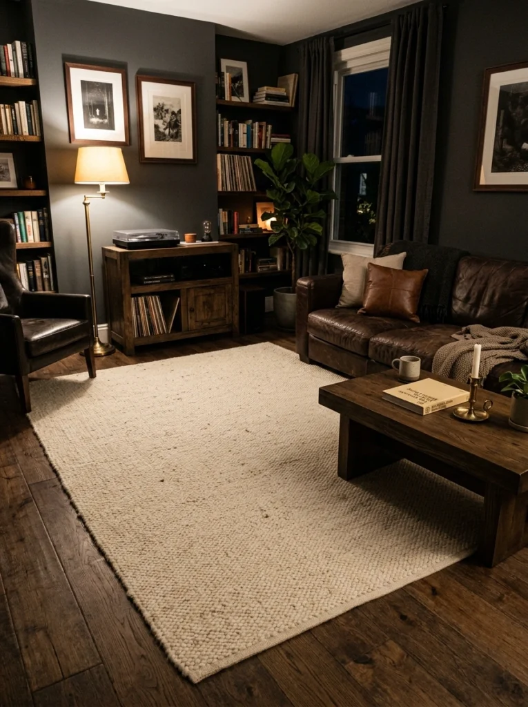 Sometimes, you just want to go dark. A pure black, low-pile rug creates a dramatic, cinematic foundation for your space. But here is the trick: you must have ample lighting and varied textures elsewhere, like a plush accent chair or rich walnut shelving. Otherwise, your floor just looks like a black hole. It’s a bold masculine living room idea that pays off massively if you balance the room’s lighting.