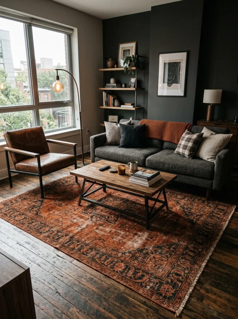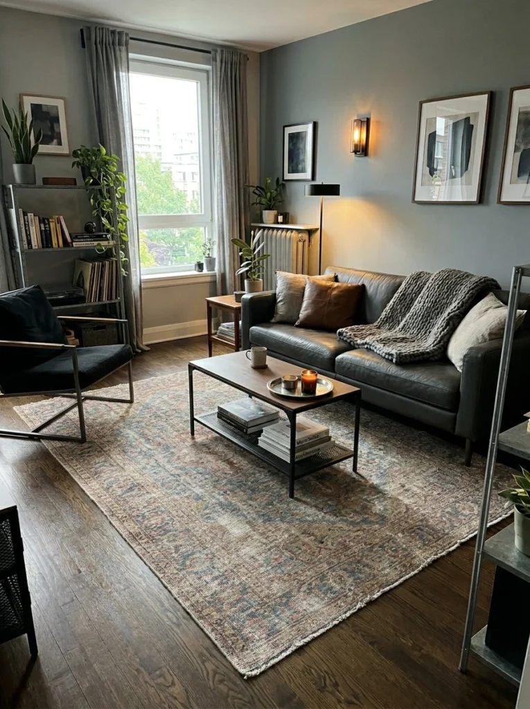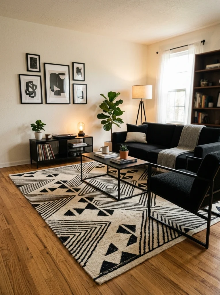 Living in a tighter space? A brilliant small apartment strategy is to use bold but simple lines to trick the eye. Choose a rug with monochrome patterns—think off-white and black intersecting geometric lines. It adds movement and architectural interest without chaos. Keep the rest of your modern men’s décor streamlined.