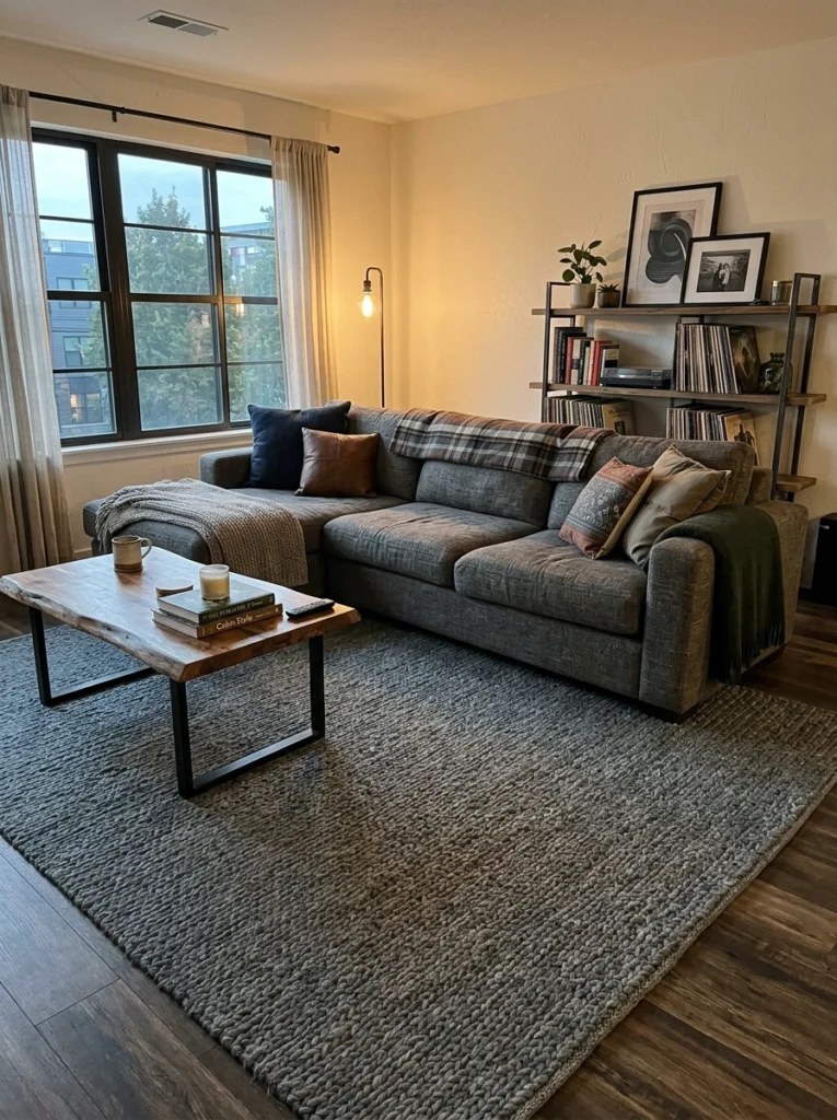 Let’s talk pure logistics and placement. If you have a massive L-shaped sectional, your rug needs to match that exact energy. When your placing the rug, ensure it extends at least 8 to 12 inches beyond the sides of the sofa. A massive, solid-color rug—maybe a muted slate—keeps the huge couch from swallowing the room whole.