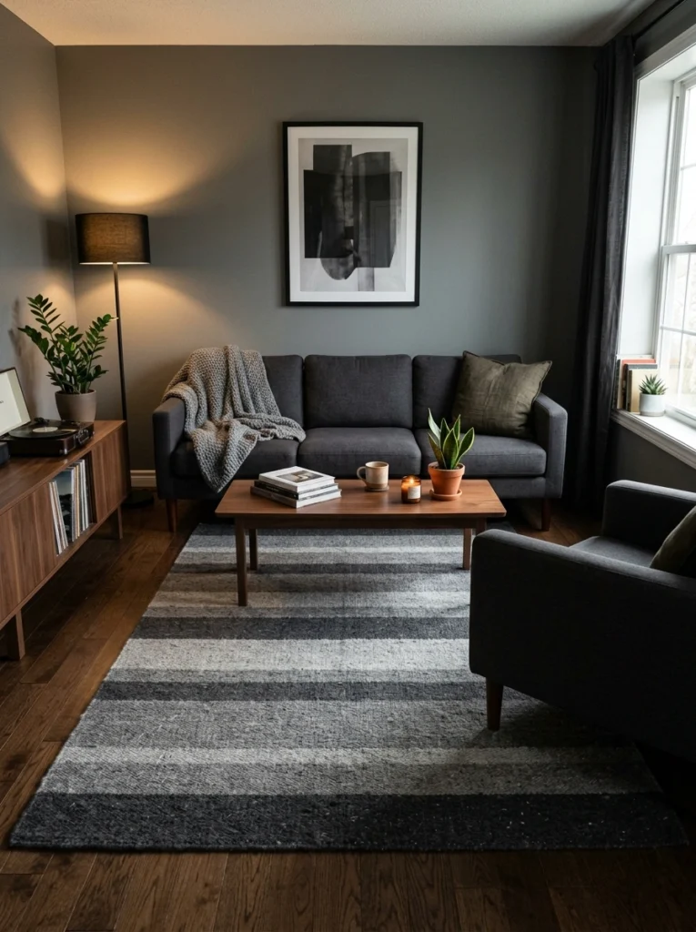 Not a fan of complicated designs but want something more dynamic than a solid block of color? Go for a tonal stripe. Think dark grey fading into slightly lighter grey. It naturally draws the eye lengthwise, making the room feel longer and more expansive. It’s a fantastic trick for awkward, narrow living rooms. Plus, it gives that tailored, pinstripe-suit energy directly to your floor.