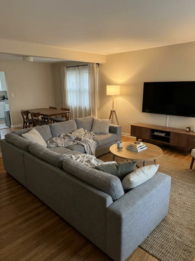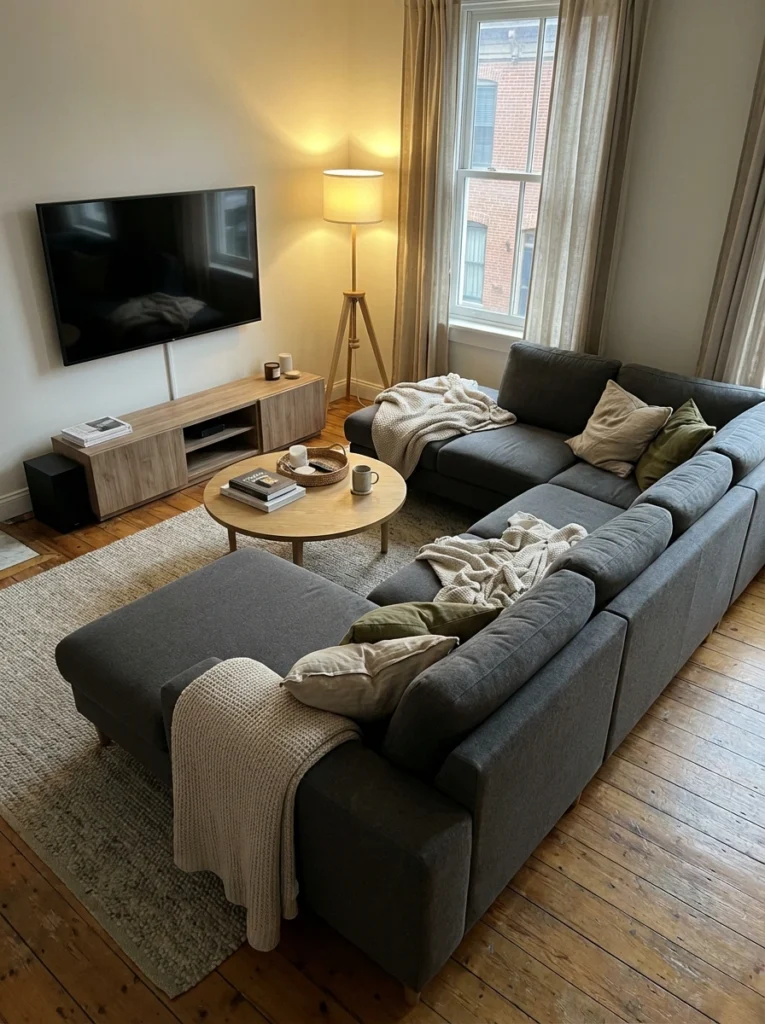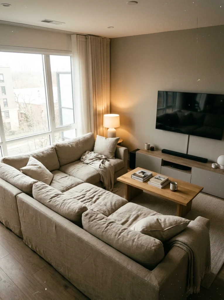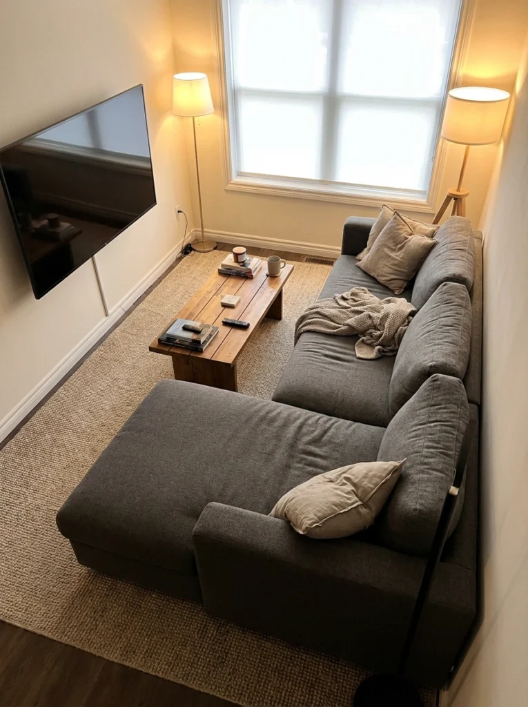 Practical Tips: Don’t jam the sofa completely against the baseboards—leave an inch or two of breathing room. Your area rug needs to anchor at least the front legs of both sectional sections. Keep lighting soft with a couple of wall sconces near the TV to reduce glare on the screen.