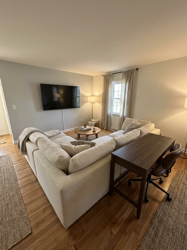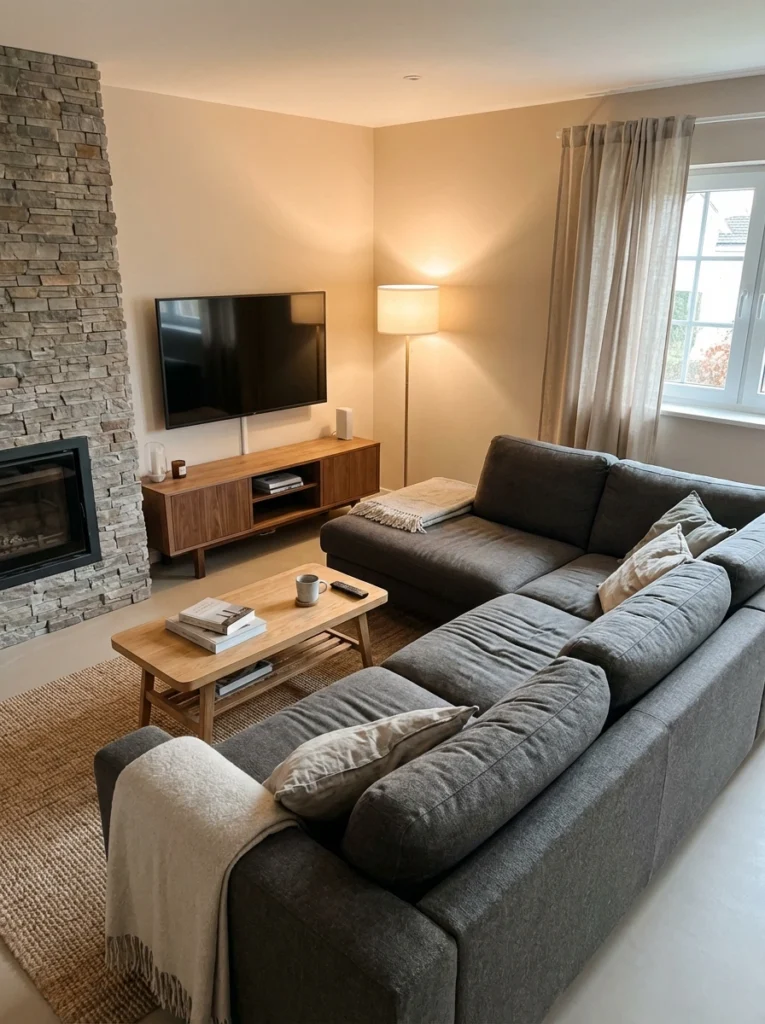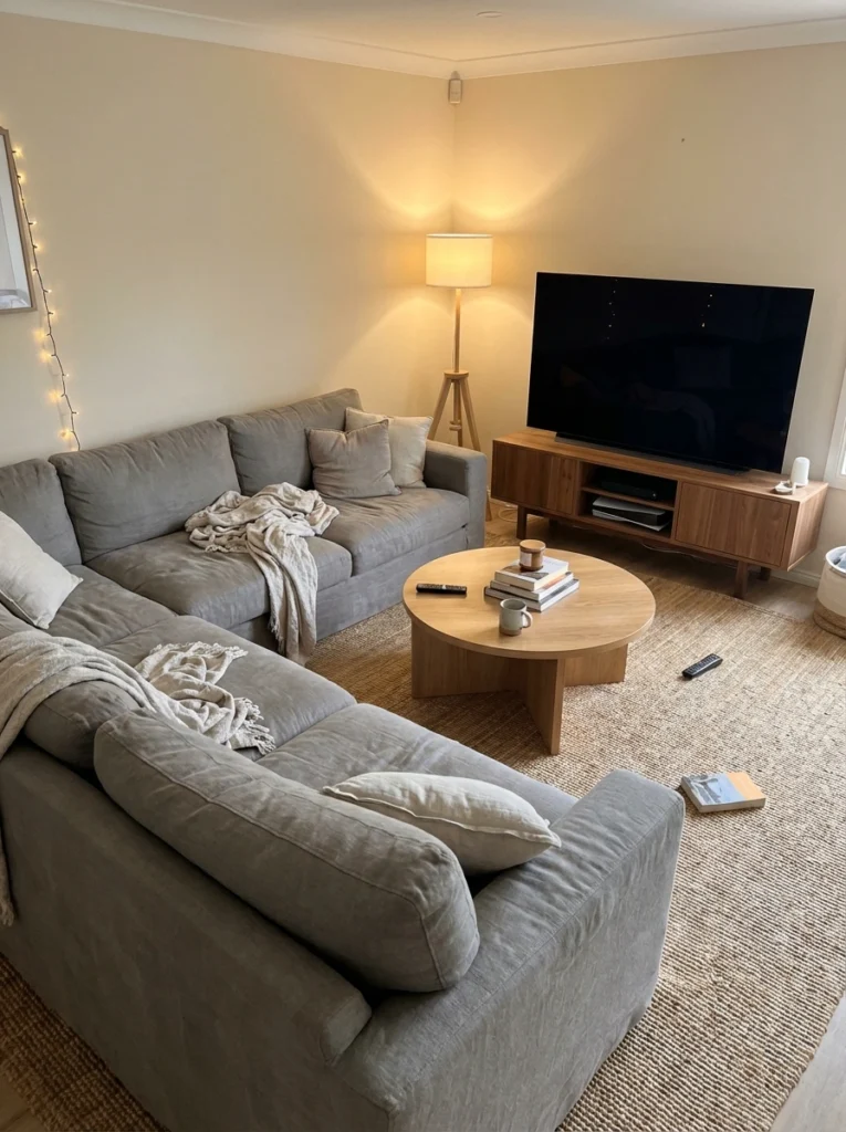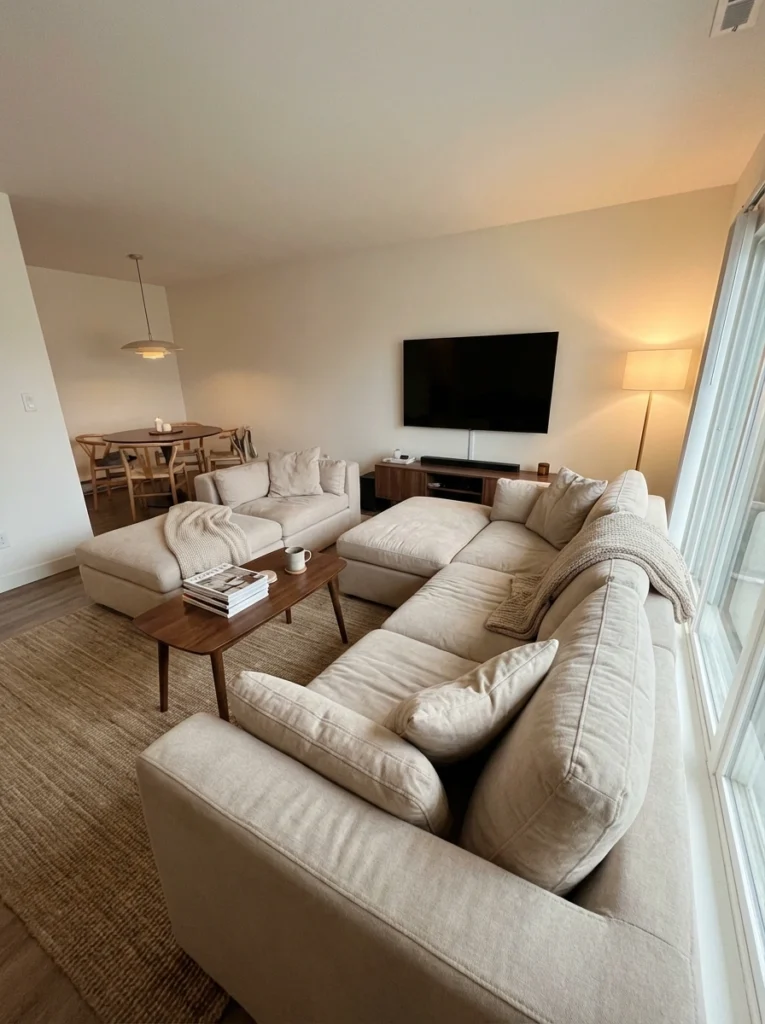 Practical Tips: Don’t jam the sofa completely against the baseboards—leave an inch or two of breathing room. Your area rug needs to anchor at least the front legs of both sectional sections. Keep lighting soft with a couple of wall sconces near the TV to reduce glare on the screen.