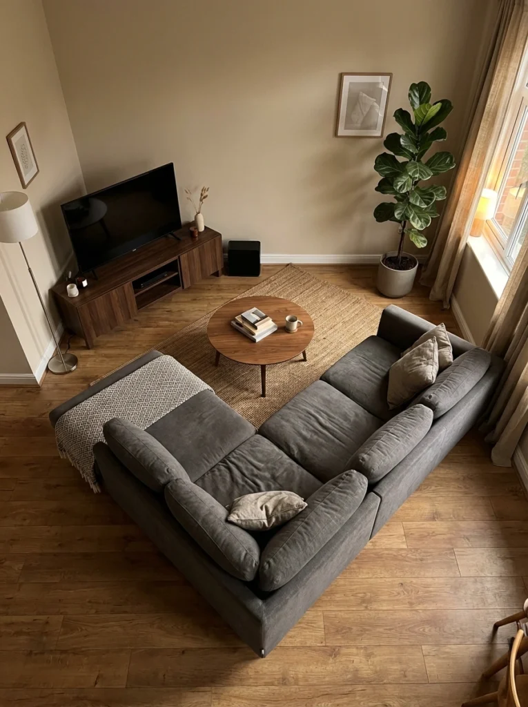 The Layout: This is your bread and butter. The L-shaped sofa is pushed snugly into the back corner of the room, facing the TV on the opposite diagonal wall. It leaves a wide-open pathway cutting straight across the room.