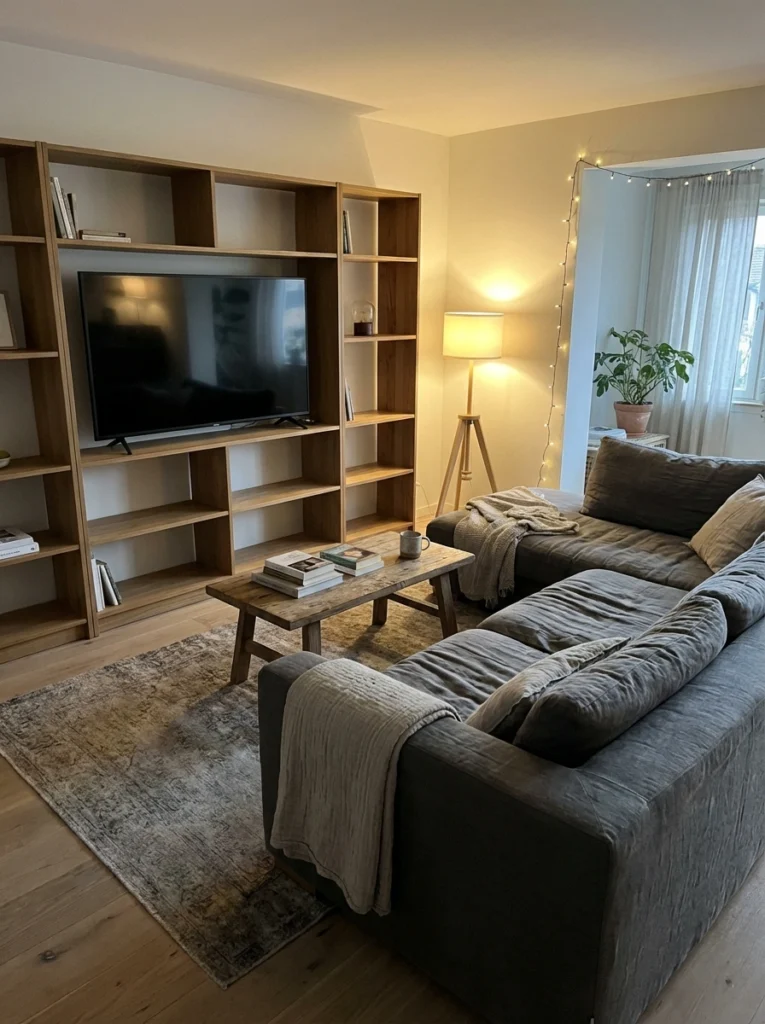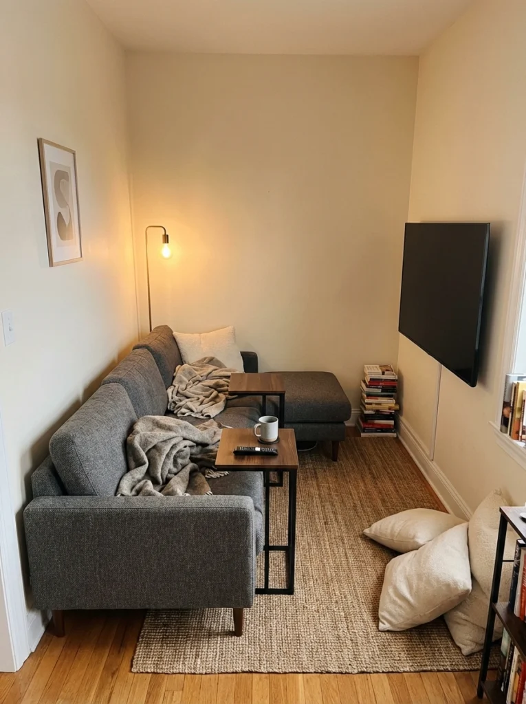 Practical Tips: Ditch the bulky coffee table entirely. Use C-tables that slide under the sofa frame to hold drinks, and rely on floating shelves around the TV for storage. Keep wall art minimal so the room doesn’t feel like a tunnel.