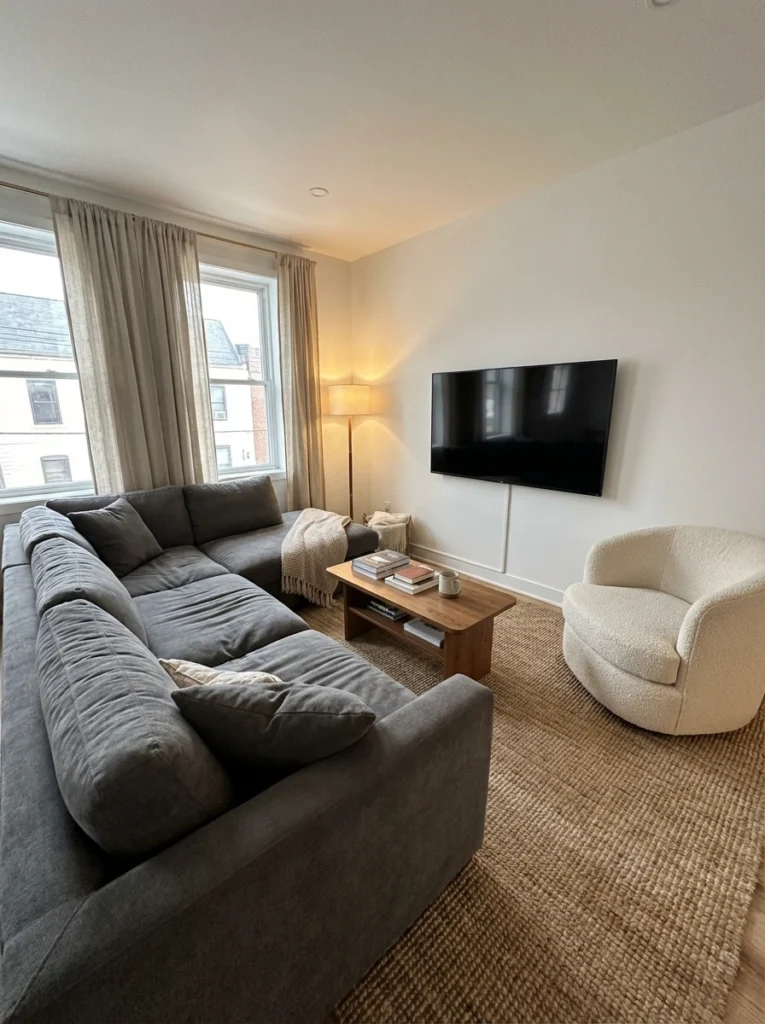 The Layout: The sectional is shifted slightly to the left or right of the TV rather than perfectly dead-center. The “empty” visual weight on the other side is balanced by a bold accent chair and a tall floor lamp.