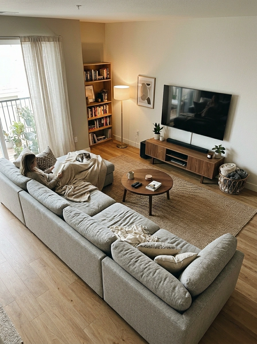 The Layout: The sectional sits perpendicular to a large window or sliding glass door. The TV is on the solid interior wall across from the sofa, avoiding the glare of direct sunlight.