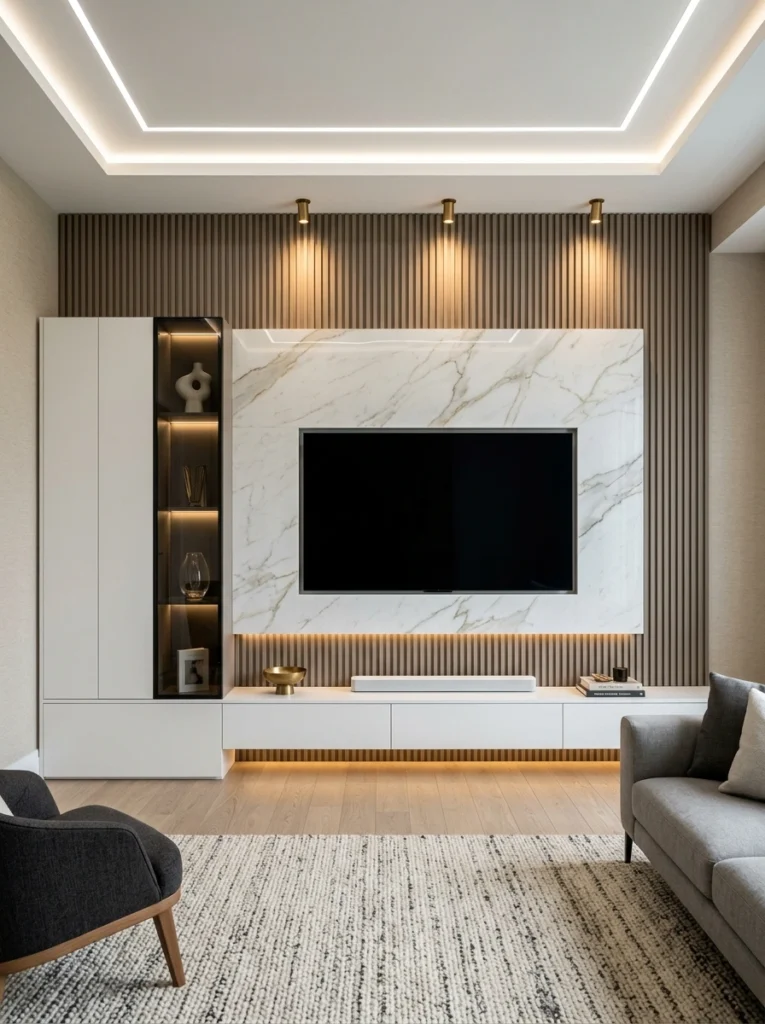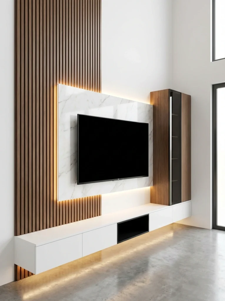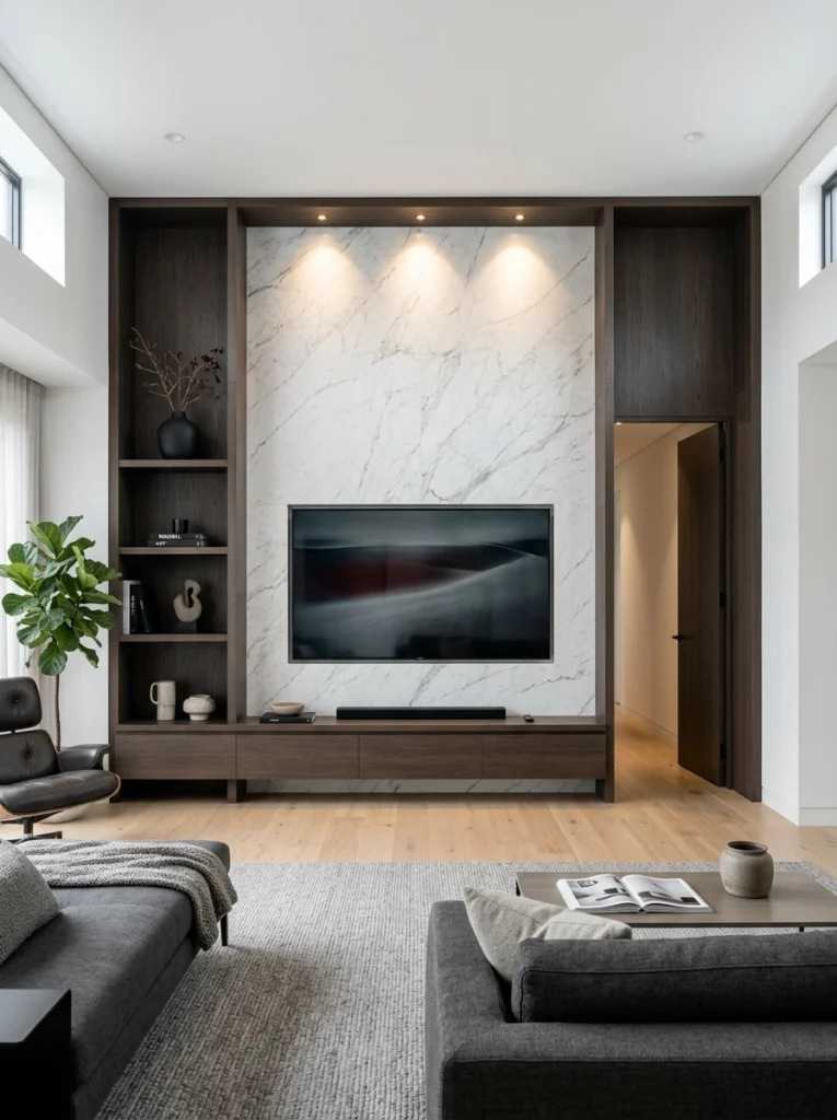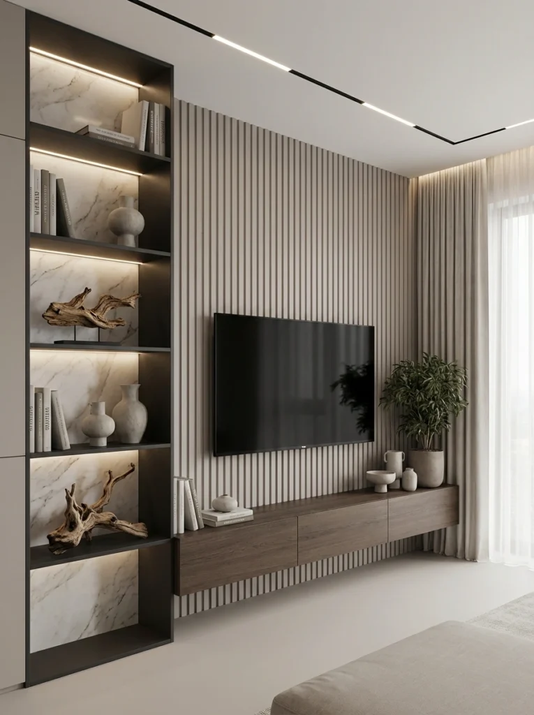 This one is a masterclass in layering! You’ve got tall wood slats, a sleek marble-look panel, and a dark wood display tower all seamlessly integrated. Because there’s so much architectural interest, keeping the surfaces completely bare allows the design itself to be the standout centerpiece. It feels incredibly cohesive, modern, and perfectly balanced.