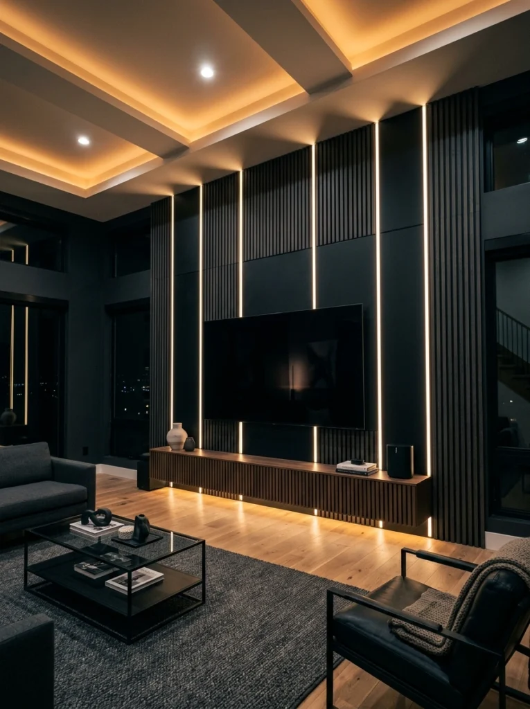 Ready for some drama? This moody, dark wall unit uses striking vertical LED light strips seamlessly integrated into dark wood slats. It’s a fantastic example of using lighting as your primary decor. The minimalist dark wood console grounds the space while maintaining the sleek aesthetic. By keeping extra decor to an absolute minimum, the architectural lighting makes a bold statement.