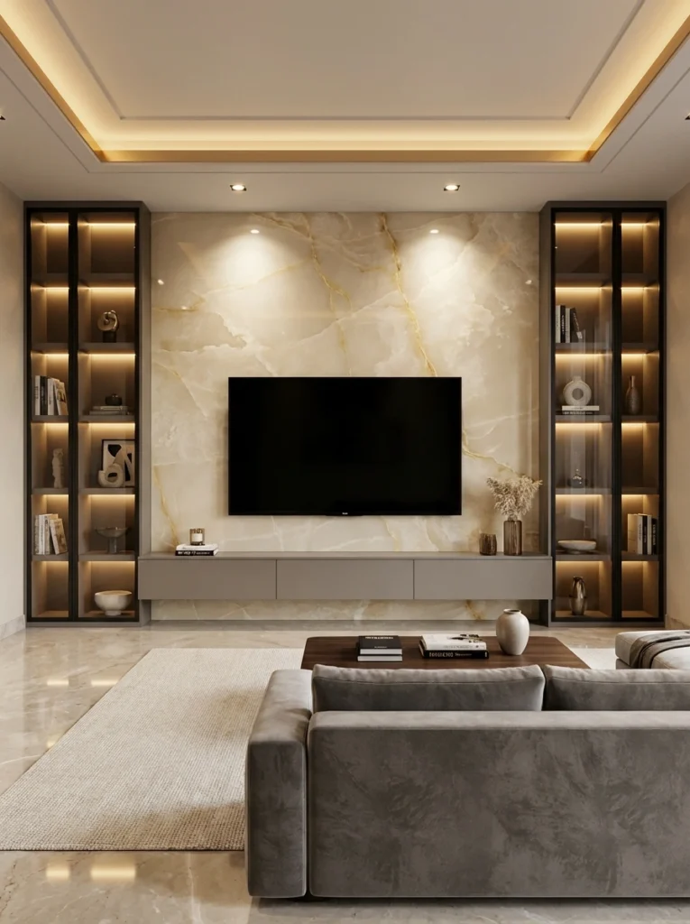 Check out this absolute stunner. Symmetrical glass display towers frame a gorgeous, illuminated stone backdrop, making a strong impact without feeling heavy. Choose decor pieces like a single ceramic vase or neutral books that feel authentic and cohesive with the luxurious palette. It’s the perfect mix of high-end elegance and intentional simplicity, letting the warm lighting be the star.