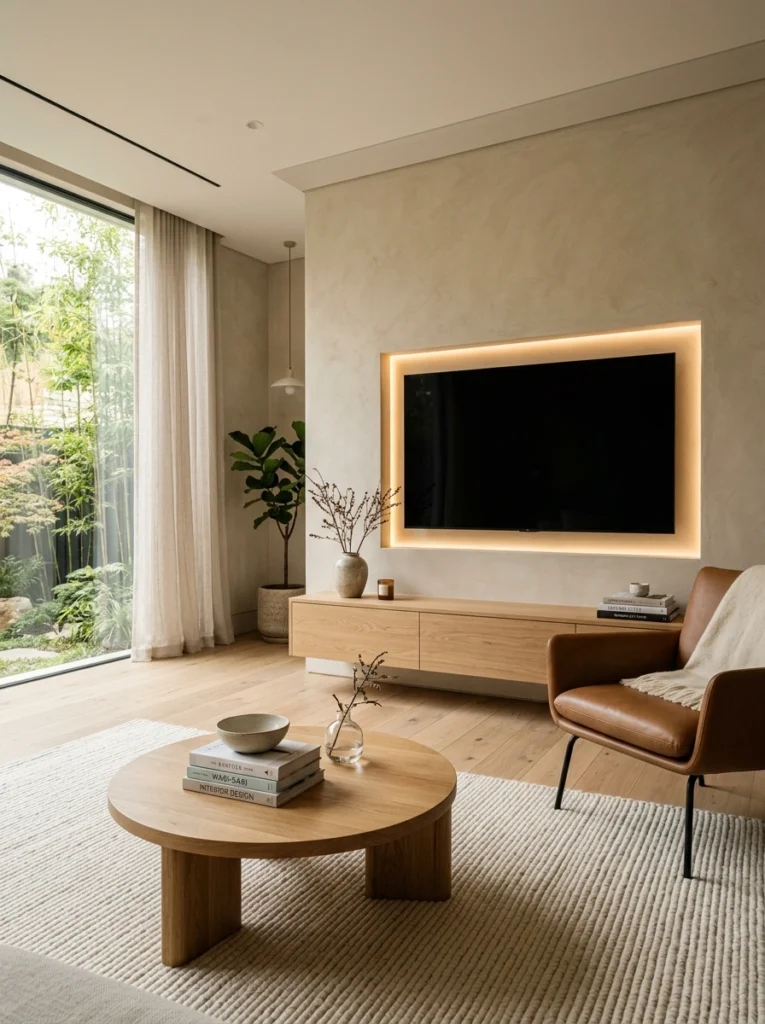 Sometimes, less really is more. This beautifully textured plaster wall features a recessed niche that frames the TV like art, highlighted by soft backlighting. Paired with an oak console, it keeps surfaces remarkably clean. A simple glass vase acts as the perfect, understated centerpiece, allowing the tranquil, cohesive palette of the room to shine.