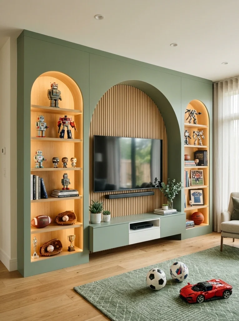 This sage green built-in is so fun and fresh! The arched alcoves with slatted wood backing create such a warm, inviting focal point. The trick here is intentional decor—group your favorite items or collectibles thoughtfully on the lit shelves so it feels curated, cohesive, and incredibly personal without ever looking cluttered.