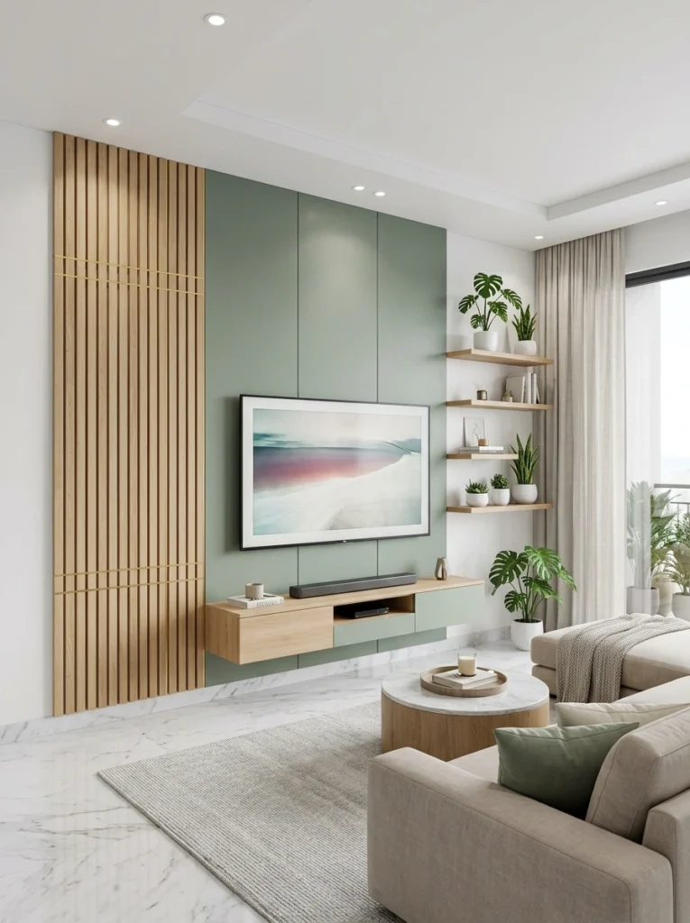 Bring a breath of fresh air into your space with soft sage green panels paired with light wood slats. Open shelving provides the perfect spot for trailing plants and minimal books, adding life without feeling heavy. The asymmetrical floating console keeps things modern and airy. By sticking to a cohesive, nature-inspired palette, this bright setup feels incredibly calming and perfectly balanced.