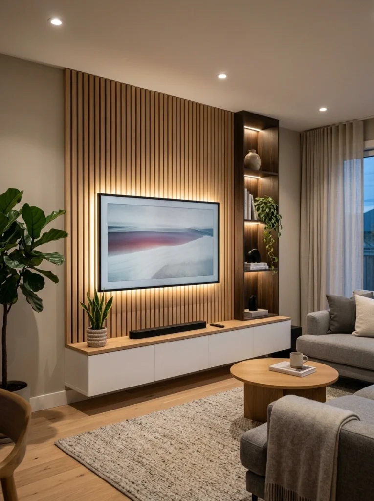 Hey there! If you love a cozy vibe, this wood slat backdrop paired with a sleek white floating console is perfect. It thrives on intentional design, using built-in warm lighting instead of clutter to make a statement. The tall side shelf lets a simple potted plant or a few books shine. Keeping the surfaces clean really allows the natural wood textures to stand out beautifully.