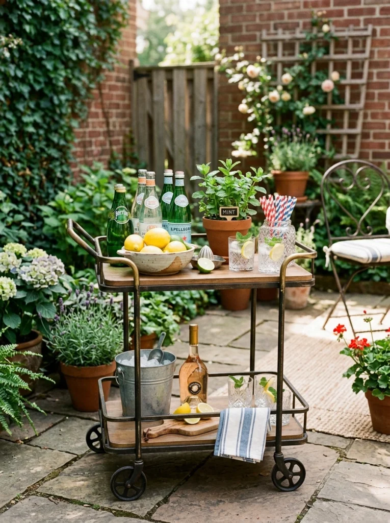 Instead of a massive outdoor dining buffet, use a slim rolling cart to hold your drinks, snacks, and even a few potted herbs. You can wheel it out of the way, push it inside when it rains, or roll it right up to your lounge chair. It feels so delightfully retro.
