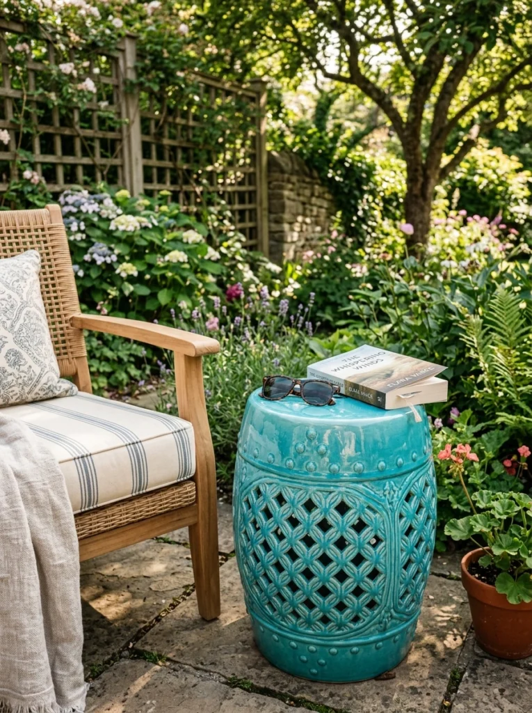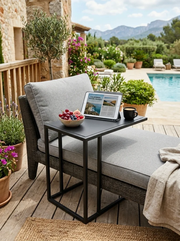 I swear by C-shaped tables for small living rooms, and they work just as beautifully outside. The base slides right under your outdoor sofa or chair, bringing the tabletop directly over your lap. It takes up virtually zero extra floor space while keeping your snack perfectly within reach.
