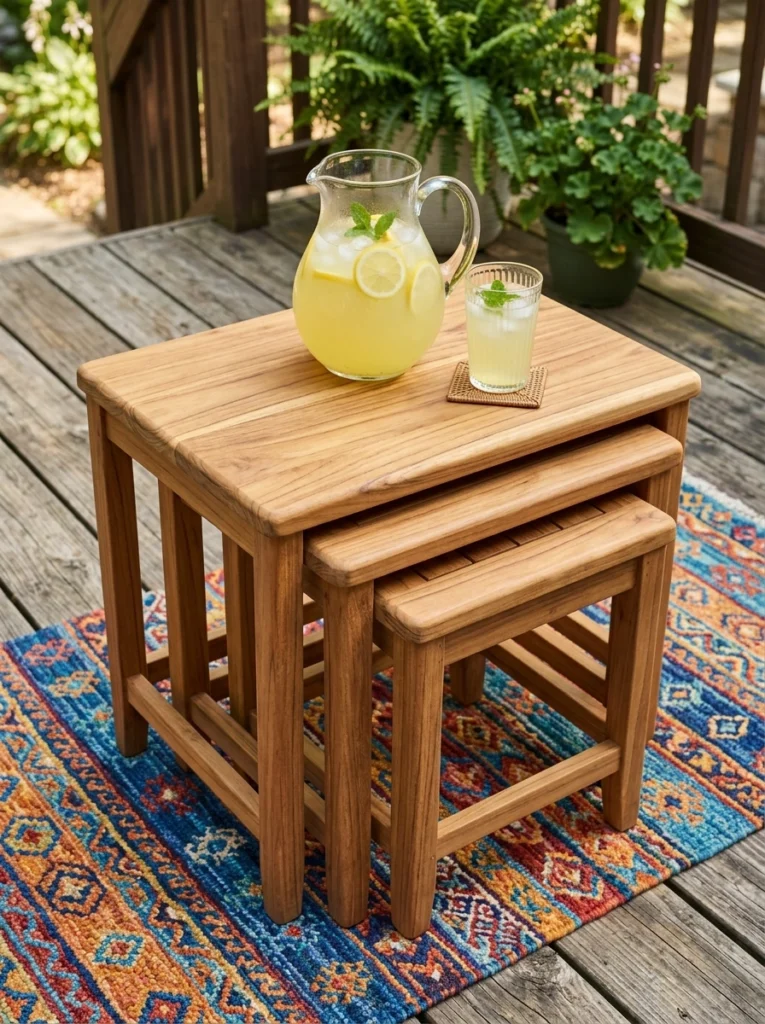 I am absolutely obsessed with nesting tables for small outdoors. You get the surface area of a coffee table when you have friends over for drinks, but you can tuck them away into one tiny footprint when it’s just you and a book. Look for weather-resistant teak or powder-coated steel!